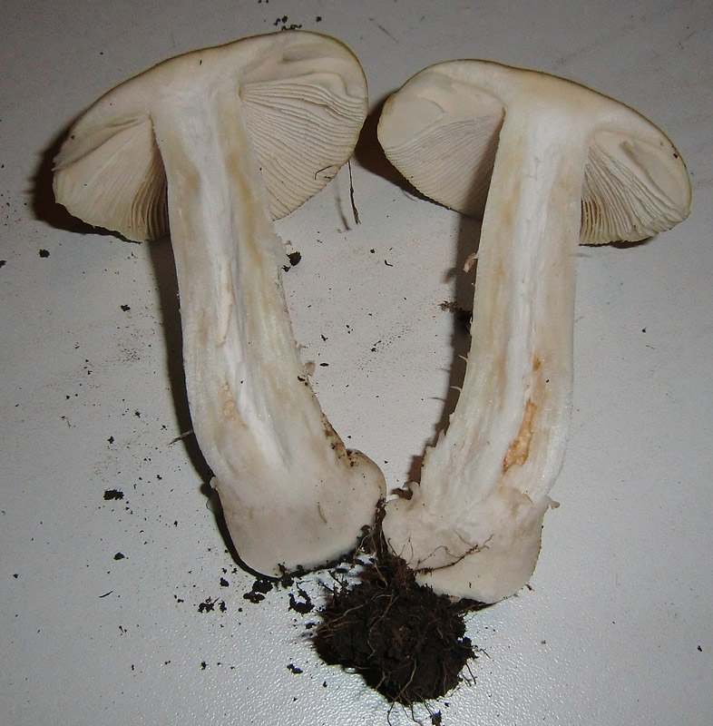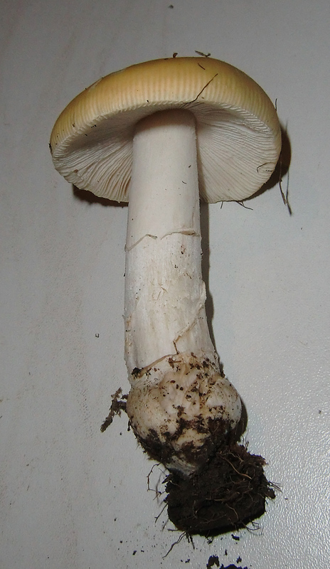 Ring fehlt oder flüchtig, ich meine da ja noch Reste erkennen zu können. Velumflocken fehlen. Hutrand gerieft. Hut: gelb, 4 cm; Stiel: weiß, 7 cm, Basis knollig; Sporenpulver: weiß. Fundort sauerer Fichtenwald, stand einzeln.