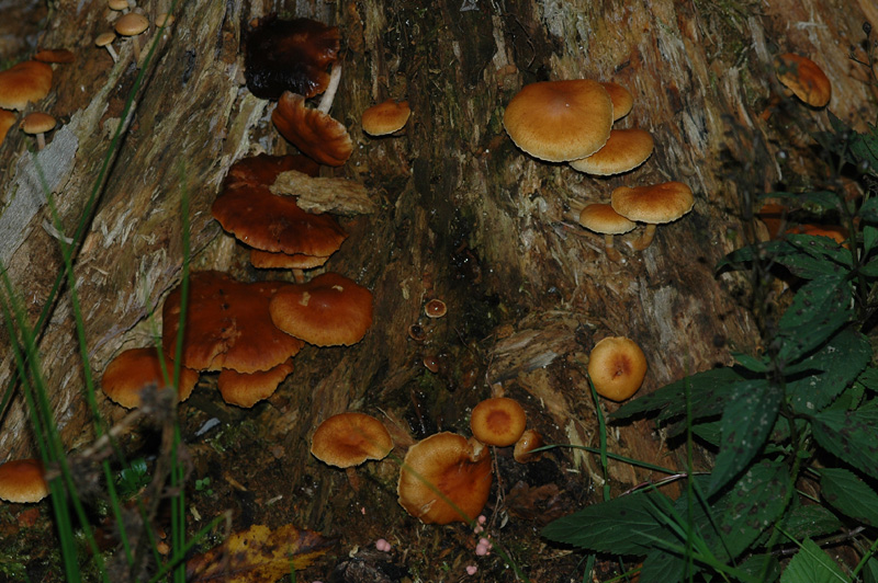 Bei deinen würde ich auch mal in Richtung Gymnopilus recherchieren, wenn es Nadelholz war (erkennt man auch das bei deinem Fund nicht?), ist es vielleicht Gymnopilus penetrans (Geflecktblättriger Flämmling), der hat aber eigentlich einen Geruch.
