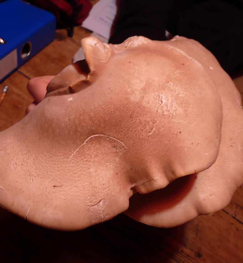 Er ist ca. tellergroß, Hut leicht schuppig und Farbe helles Braun