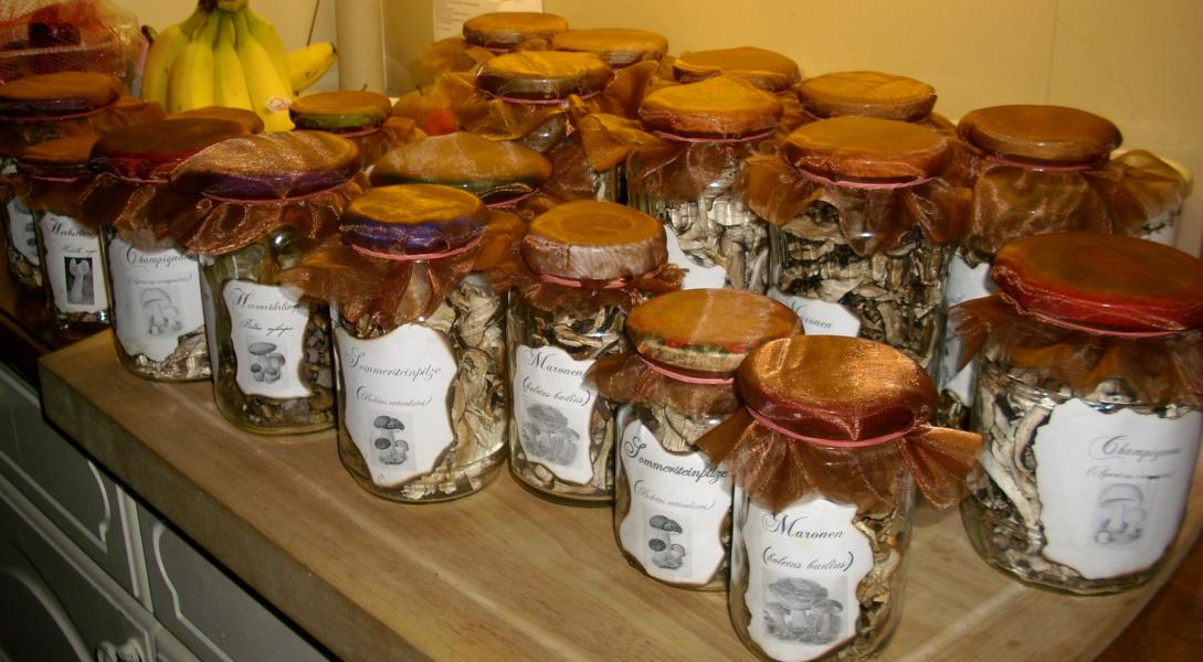 Wir haben unssere gesammelten Pilze allesamt in Keramikbüchsen verstaut (es gibt da diese Serie von "Asa", weiß mit schwarzem Schieferfeld zum Beschriften, unten ein paar Löcher, damit ein bisschen Luft drankommt, sind ganz praktisch.)
