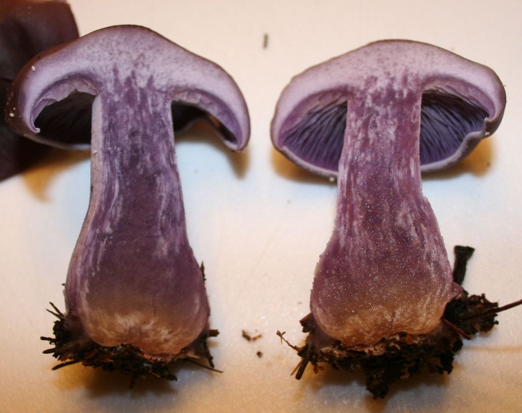 an der Schaftbasis gelblich, sonst lila marmoriert, im Hut heller bis wässerig (ähnlichkeit mit nassem schwamm) in der Mitte ist ein schlauchiger sehr dünner Hohlraum