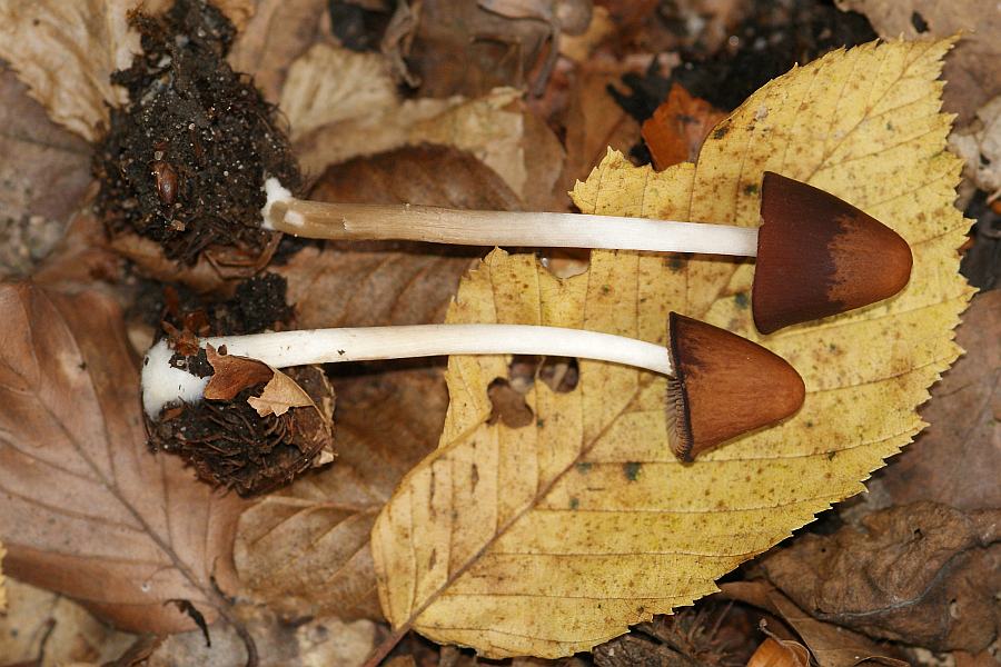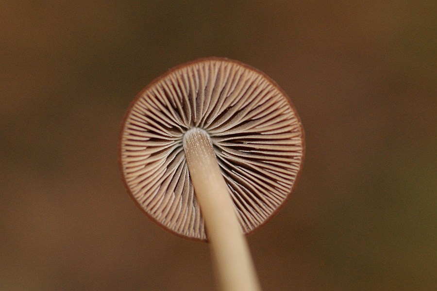 Hut sehr glockenförmig, ca. 1,5 - 2 cm hoch, sieht mir sehr nach hygrophan aus. Lamellen rötlichbraun, an den Schneiden heller (vielleicht von weißem Sporenpulver?). Der Stiel ist 4x so lang wie die Hutlänge, also ca. 8 cm, oben leicht rillig und ebenfalls etwas weißlich bereift (vielleicht auch von Sporenpulver?). Stiel in der oberen Hälfte weiß, in der unteren Hälfte bräunlich. Beim oberen Fruchtkörper ist dies viel stärker ausgeprägt als beim unteren. Stielbasis üppig mit weißem Myzel bedeckt. Hut elastisch, fühlt sich wie glattes Gummi an.