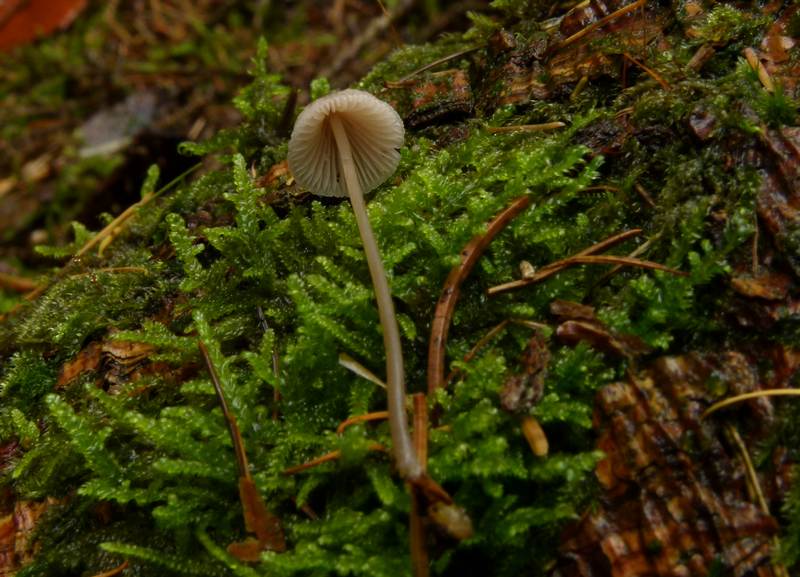 Das sind doch Helmlinge? Aber welche? Gerochen haben sie nicht - vielleicht war's aber nur verwässert, hat die ganz Zeit geregnet. Beim "Pflücken" erwies sich der lange, dünne Stiel als spröde und knickte leicht ab. Der Hut hatte wohl kaum einmal 2 cm.