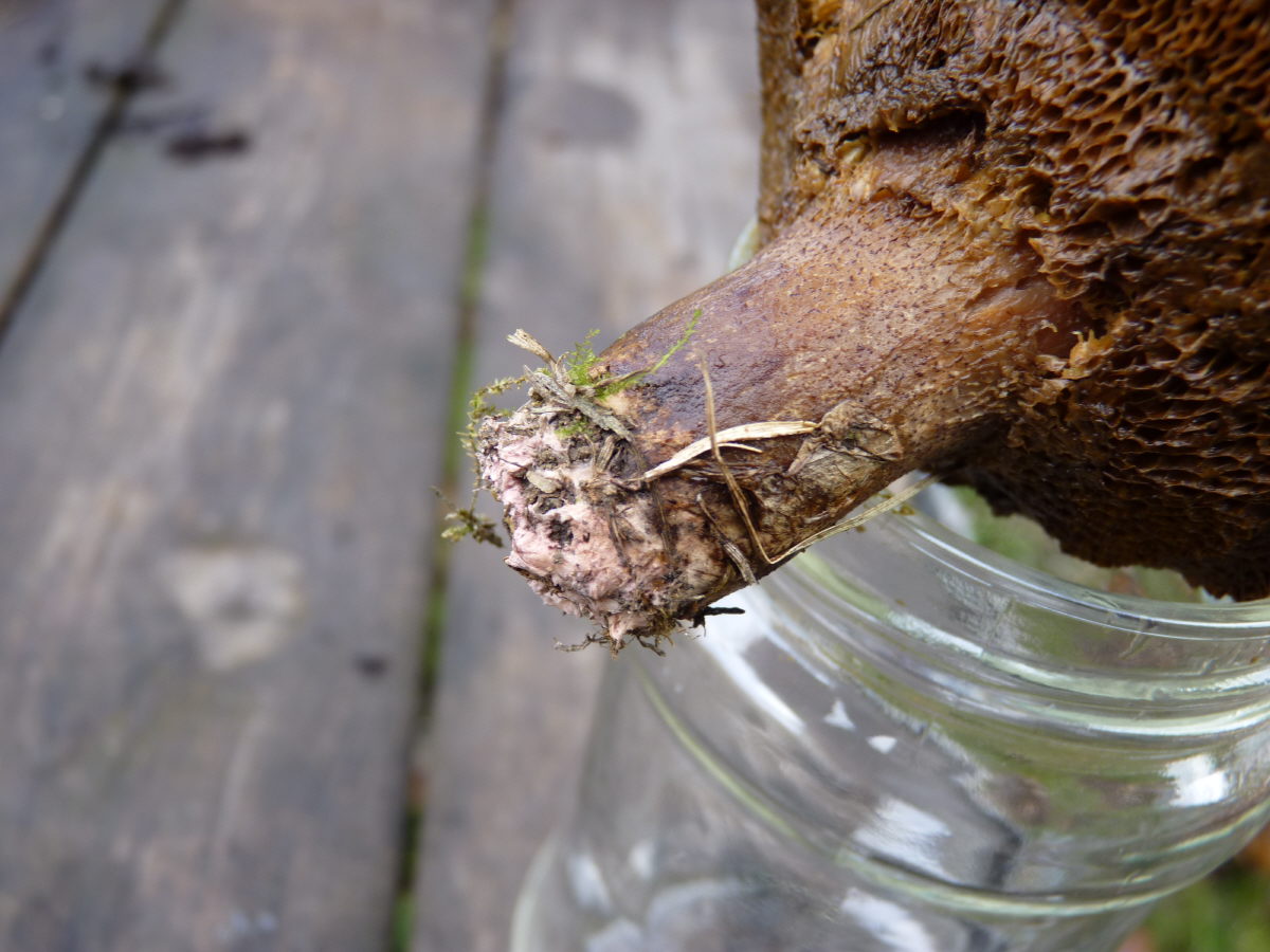Nachdem das Myzel so ausgeprägt ist, habe ich den vergammelten Pilz inzwischen unter der Kiefer abgelegt und zwar so, dass das Mycel Bodenkontakt hat. Hoffentlich lacht ihr mich nicht aus :cool: