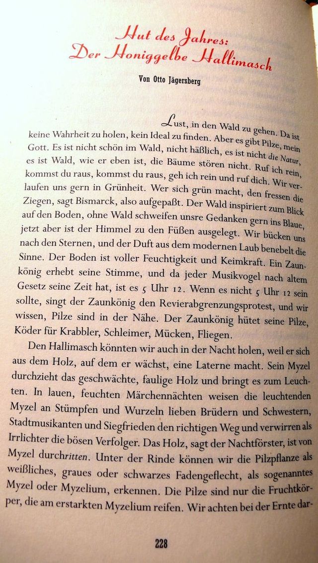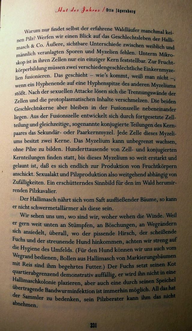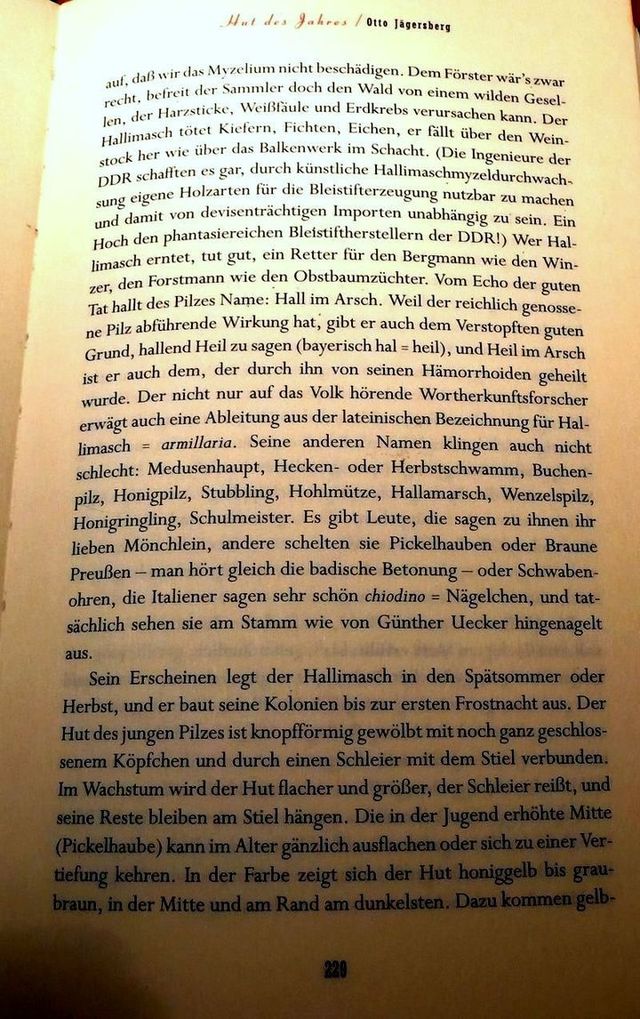 "Vom Echo der guten Tat hallt des Pilzes Name: Hall im Arsch. Weil der reichlich genossene Pilz abführende Wirkung hat, gibt er auch dem Verstopften guten Grund, hallend Heil zu sagen (bayrisch hal = heil), und Heil im Arsch ist er auch dem, der durch ihn von seinen Hämorrhoiden geheilt wurde. Der nicht nur auf das Volk hörende Wortherkunfstforscher erwägt auch eine Ableitung aus der lateinischen Bezeichnung für Hallimasch = armillaria. Seine anderen Namen klingen auch nicht schlecht: Medusenhaut, Hecken- oder Herbstschwamm, Wenzelspilz, Honigringling, Schulmeister. Es gibt Leute, die sagen zu ihnen ihr lieben Mönchlein, andere schelten ihn Pickelhauben oder Braune Preußen - man hört gleich die Badische Betonung - oder Schwabenohren, die Italiener sagen sehr schön chiodino = Nägelchen, und tatsächlich sehen sie am Stamm wie von Günther Uecker hingenagelt aus."..."Der Hallimasch nährt sich vom Saft ausfließender Bäume, so kann er nicht schwermetallärmer als diese sein."..."Den Hallimasch könnten wir auch in der Nacht holen, weil er sich aus dem Holz, auf dem er wächst, eine Laterne macht. Sein Myzel durchzieht das geschwächte , faulige Holz und bringt es zum Leuchten."