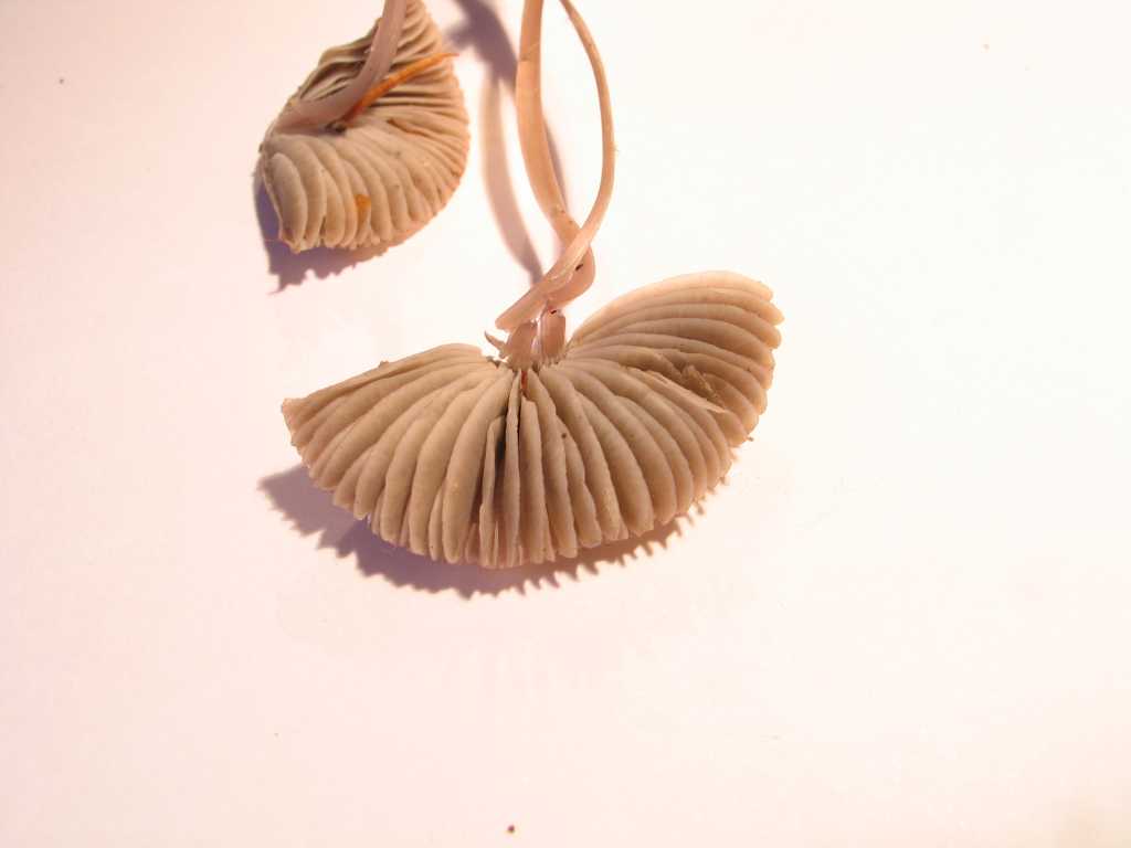 Dieses Pilzchen habe ich gestern bei der Austernsuche entdeckt. Habe ihn erst in eine falsche Pilzgattung eingeordnet, dann gemerkt, daß seine Lamellen mit einem winzigen Zähnchen am Stiel herablaufen(im 5. Bild knapp zu erkennen,; das Zähnchen hängt noch am Stiel, der Hauptkörper der Lamelle ist vom Zähnchen abgerissen).