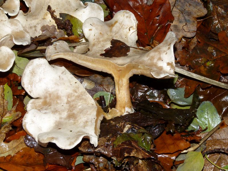 diese Pilze hier habe ich am 11.November am Ufer einer Brackwasserbucht in Lübeck unter Laubbäumen gefunden. Sie wuchsen in Gruppe, einen besonderen Geruch habe ich nicht festgestellt (wäre bei dem nassen Wetter wohl auch nicht viel zu riechen gewesen). Von einem Pilz habe ich mal ein Stück abgebrochen, hier ein paar Fotos.