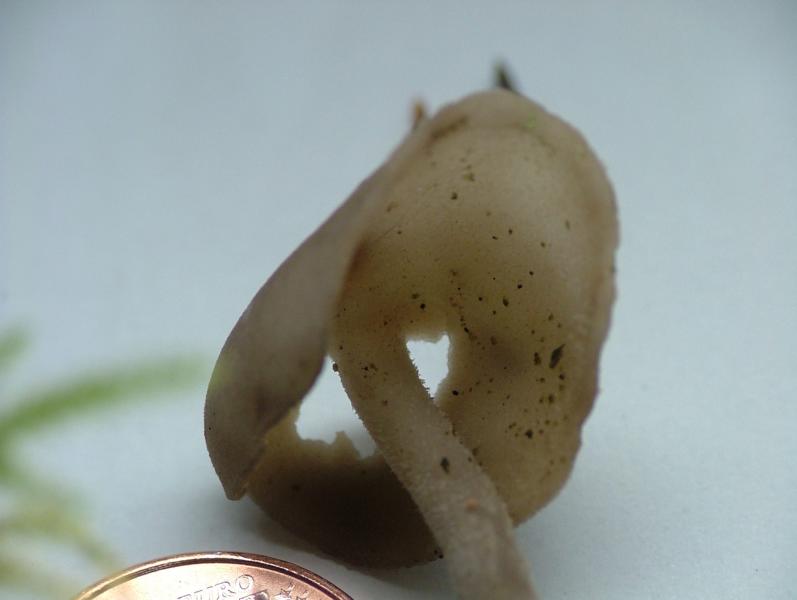 Diese Woche fand meine Frau am Nordhang des Wiehengebirges in einem sehr feuchten Fichtenhochwald mit eingestreuten Erlen auf bemoosten Flächen ein kleines Pilzchen, das mit der zur Vefügung stehenden Literatur nicht zugeordnet werden konnte. Der erste Eindruck geht zu Helvella/Leptopodia - Glattstiel-Lorchel.