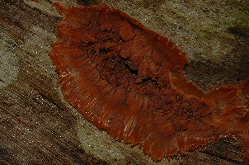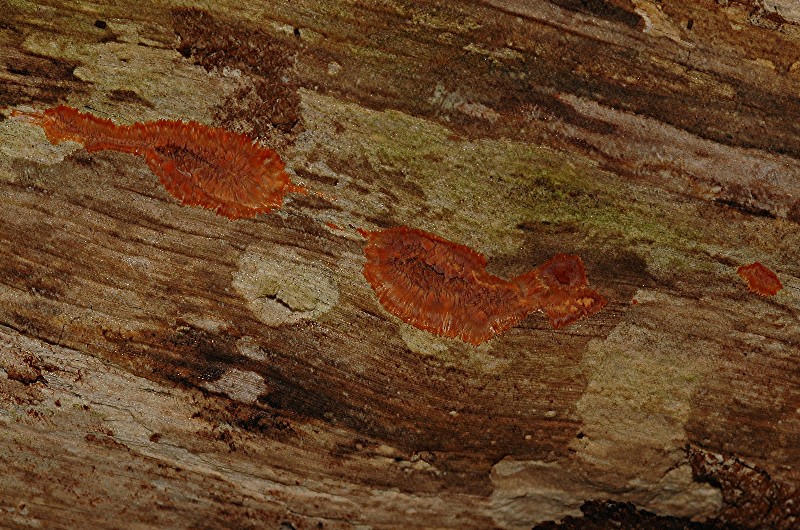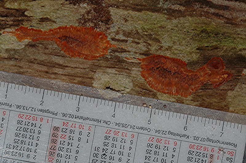 auf demselben Stamm, an dem ich den Gelbstieligen Muschelseitling gefunden habe (Kleiner Teufelsbrunnen, ein Auenwäldchen bei Schwaikheim, WN, Baden-Württemberg), entdeckte ich heute (05.12.2010) auch diesen Pilz. In meinen Büchern stieß ich auf diesen Pilz: Orangeroter Kammpilz, Phlebia merismoides, oder ist da der kriegelsteiner schon wieder überholt so daß es richtig Phlebia radiata heisen muß.