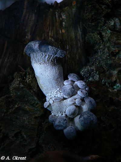 Ja, die ständig wechselnden Temperaturen hat denen ein bissel zu schaffen gemacht, aber in Verwesung begriffen waren sie noch nicht. Bei den Aufnahmen habe ich übrigens mal auf die Faltaufheller und Blitzlicht verzichtet und die Pilze mit einer Tachenlampe angeleuchtet - deswegen der Titel