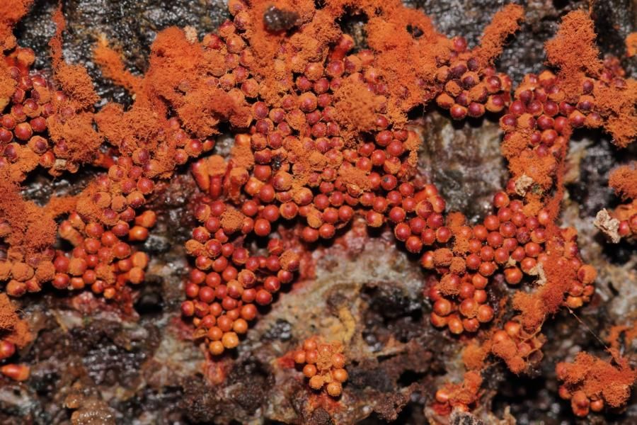 Hallo, habe da heute einen orange - /rötlichen Pilz gefunden. Die Pilzsporen (rötlich) verteilen sich beim Anfassen ähnlich wie bei den "Stäublingen", Substrat Totholzbuche. vg, Bernhard