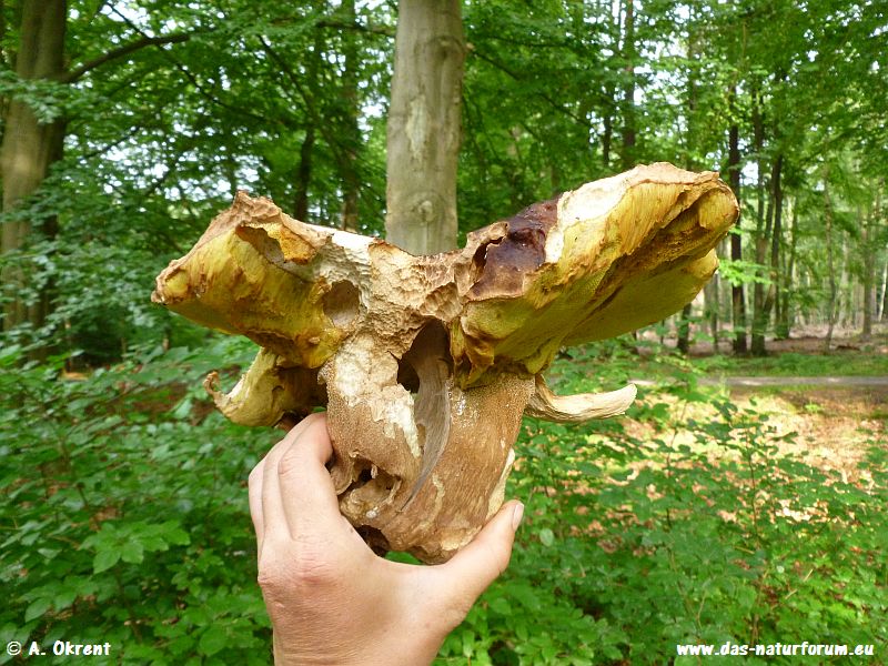 Dieser hatte einen Kappendurchmesser von 27 cm. Zu gebrauchen sind solch alte Pilze nicht mehr, so blieb er letzten Endes im Wald und sorgt hoffendlich noch für Nachwuchs ;)