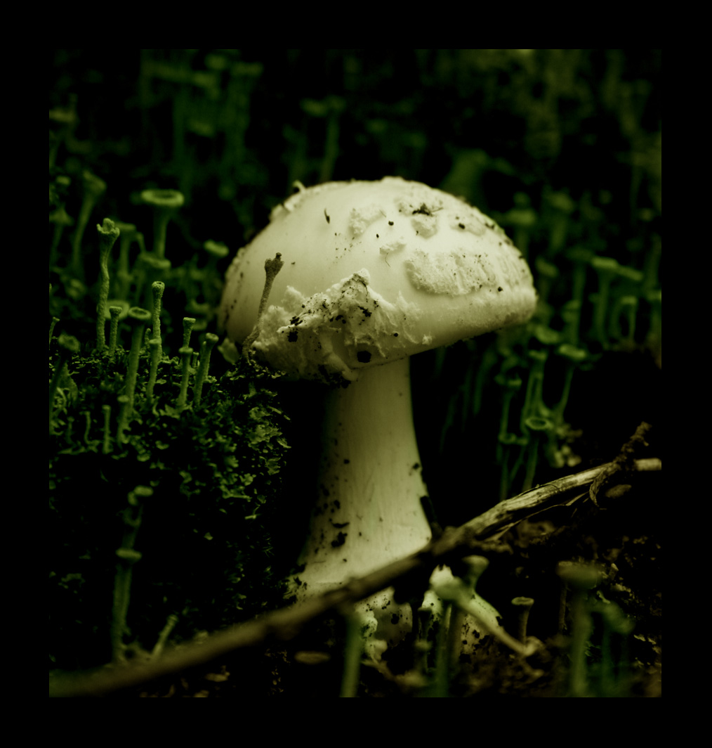 Das erste Bild zeigt einen Gelben Knollenblätterpilz (Amanita citrina) mit der Echten Becherflechte (Cladonia pyxidata).