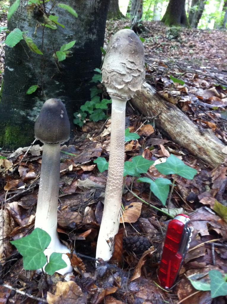 • Der Grosse ist etwas grenzwertig vom Zustand, da der Hut ja schon etwas hochgeht (d.h. die Lamellen die Hutoberseite überholen). Aber es ist ein Riesenschirmling (einer davon sehr wahrscheinlich ein Parasol, der kleinere eine Art davon).