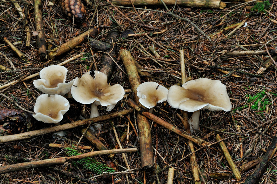 Bei den anderen gezeigten Exemplaren war ich auf Grund der ausgeprägten Grautöne dieser noch jungen Exemplare zuerst etwas skeptisch, aber der doch typisch dimensionierte Stiel lassen mich auch hier eher den Keulenfuß-Trichterling vermuten, der zudem auch wunderbar zum Fichtenwald passt.