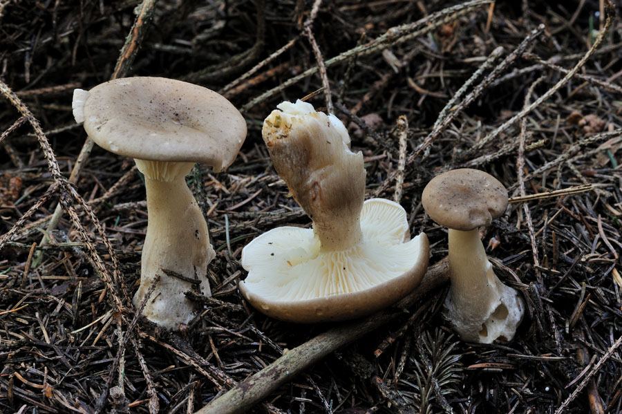 Bei den anderen gezeigten Exemplaren war ich auf Grund der ausgeprägten Grautöne dieser noch jungen Exemplare zuerst etwas skeptisch, aber der doch typisch dimensionierte Stiel lassen mich auch hier eher den Keulenfuß-Trichterling vermuten, der zudem auch wunderbar zum Fichtenwald passt.