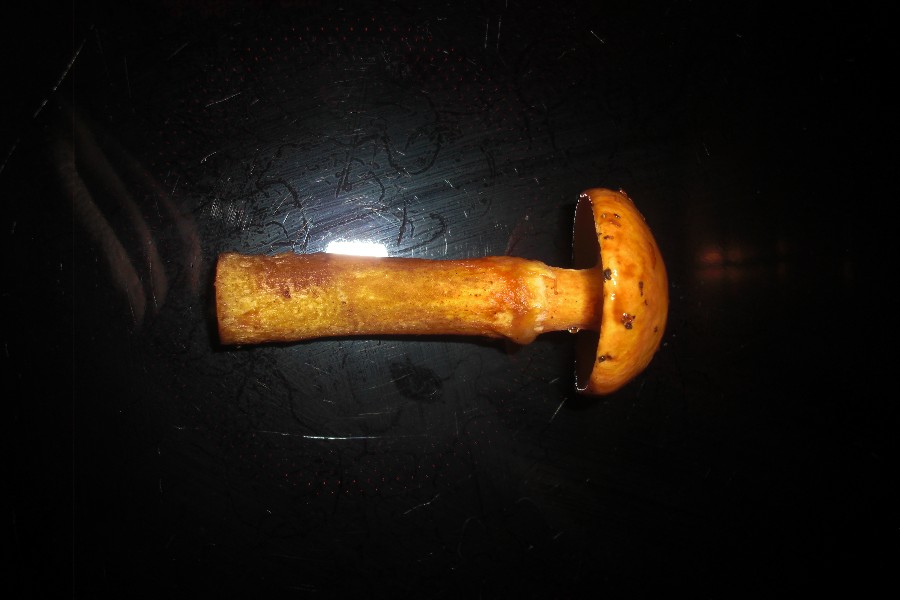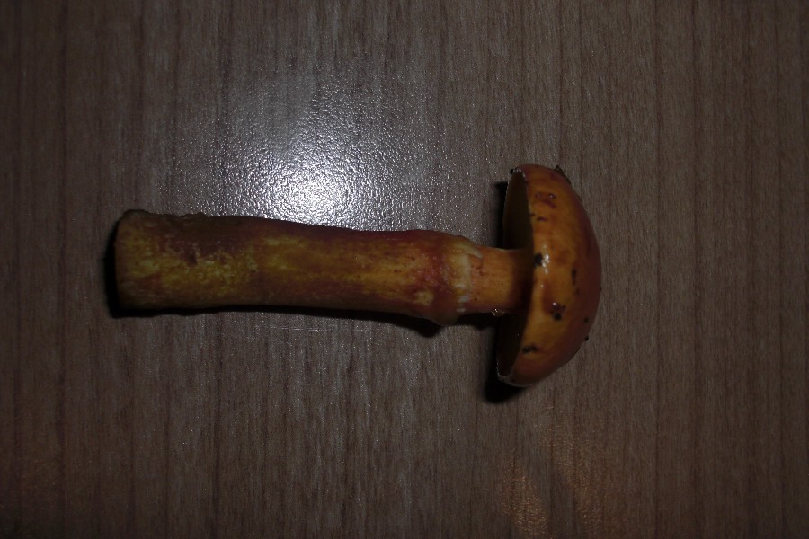 • Beim 2. dachte ich an einen flockenstieligen Hexenröhrling. Beim Anschnitt hat er sich sofort dunkel verfärbt (schwarz blaue Tinte). Die Aufnahme war leider erst abend nach ca. 8 Stunden.