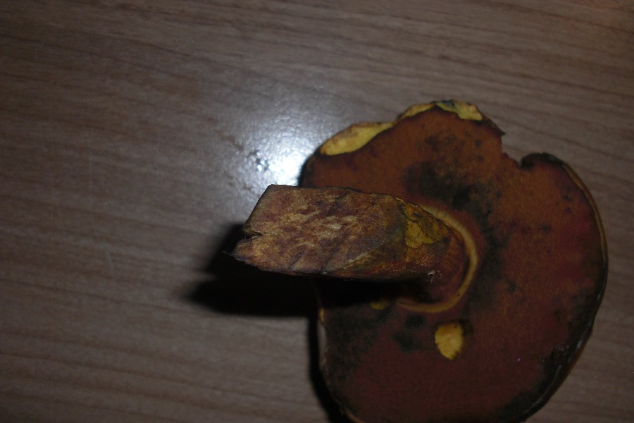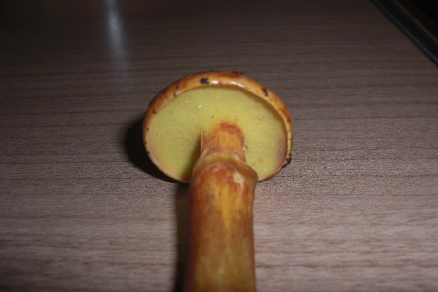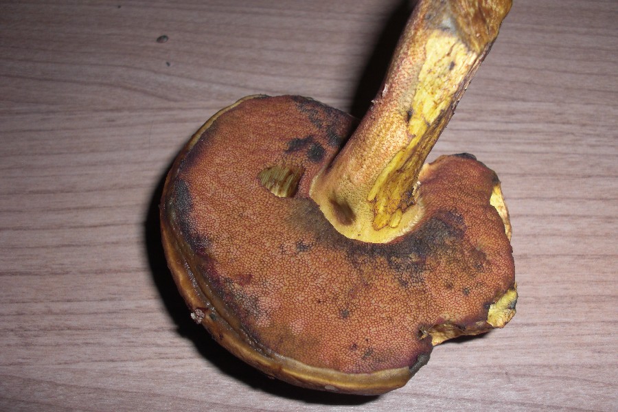 Beim 2. dachte ich an einen flockenstieligen Hexenröhrling. Beim Anschnitt hat er sich sofort dunkel verfärbt (schwarz blaue Tinte). Die Aufnahme war leider erst abend nach ca. 8 Stunden.