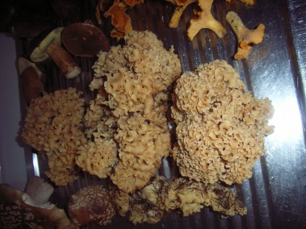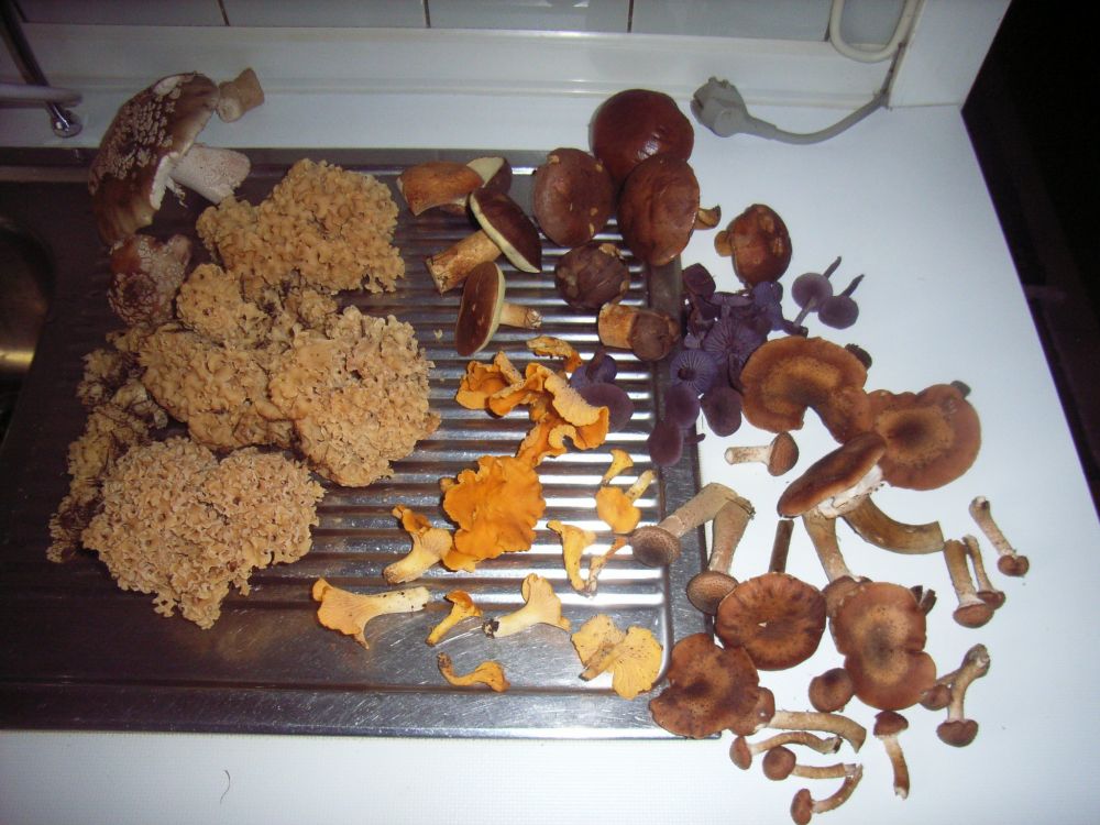 Perlpilze, Maronen, Pfifferlinge, Violette Lacktrichterlinge, Hallimasch und 2 Krause Glucken (sind es doch, oder? bin mir zwar zu 99,9 % sicher, aber meine Familie glaubt mir nicht, dass man die essen kann...)