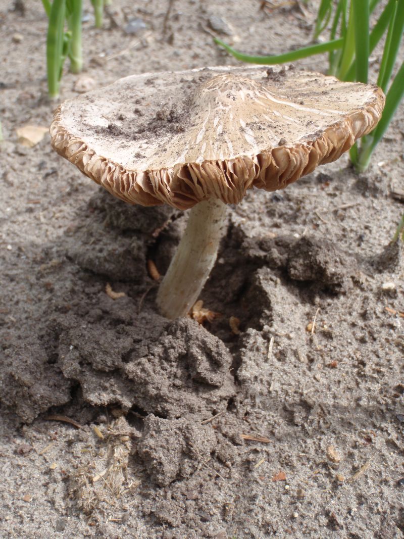 Pilz Nr. 2 war zu Anfang Glockenförmig und hatte einen silbrig wirkenden Hut. Die Wurzel ist ca. 3cm lang und 1,5 - 2cm dick, der Stiel wird im oberen Bereich dünn, ca. 1cm.