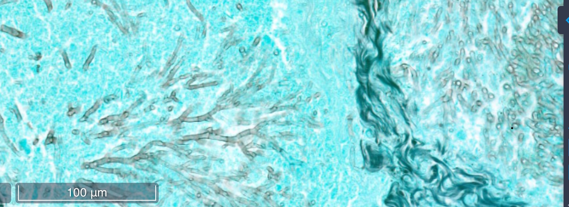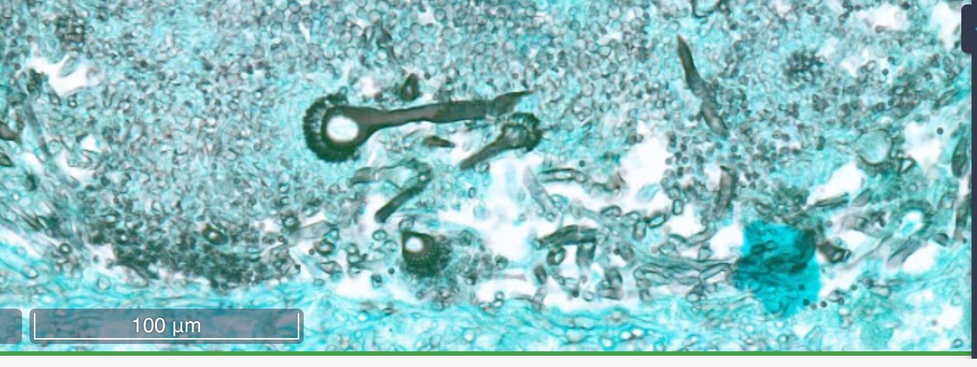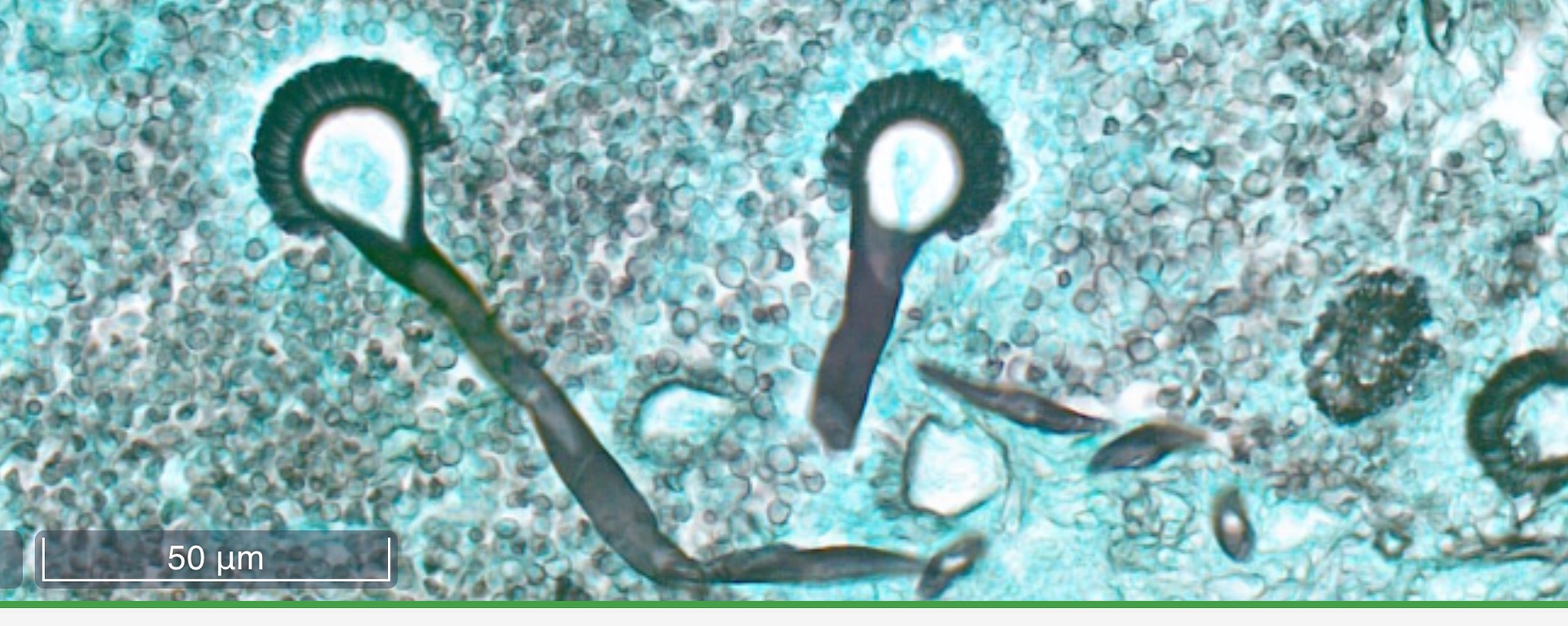 Hier besonders, Ausbildung von Konidien, welche sich im Schnitt als kleine Perückenköpfe zeigen.