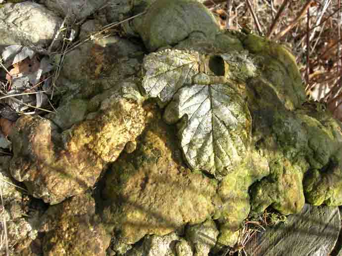Im Wald habe ich auf einem Baumstrunk einen Pilz gesehen, auf welchem ein Pflanzenblatt konserviert wurde. D.h. wie ein versteinertes Blatt, nur eben nicht an einem Stein, sondern auf einem Pilz, also eine Art "Verpilzung" des Blattes. Dieses Blatt befindet sich nun schon mehrere Jahre auf dem Pilz, es ist also konserviert, es verdorrt nicht.