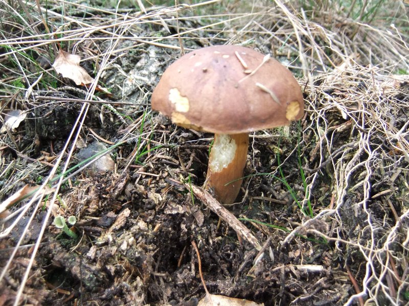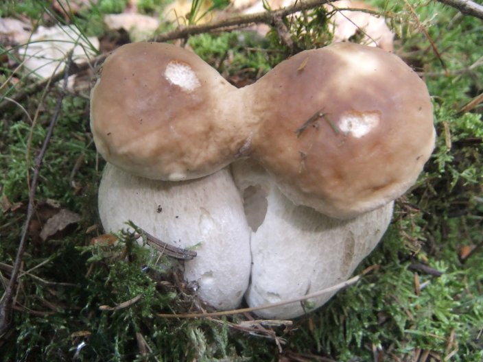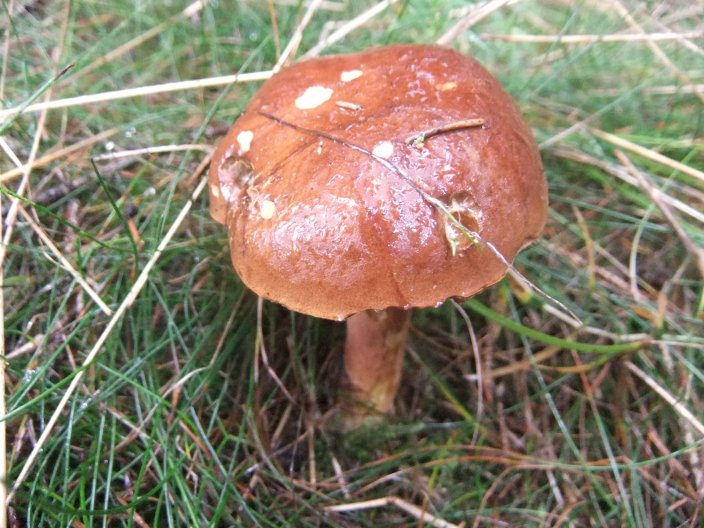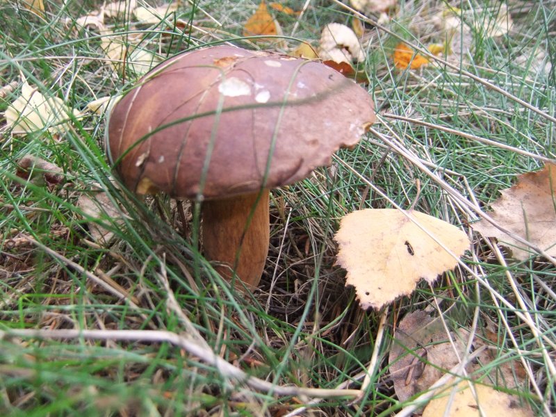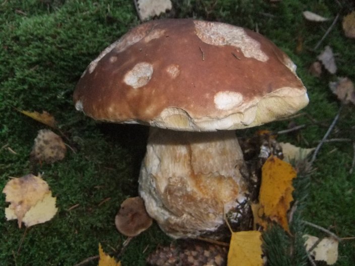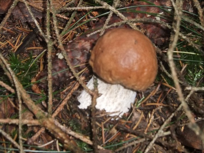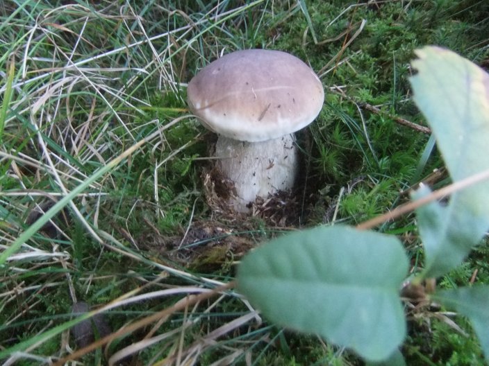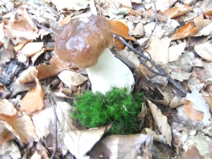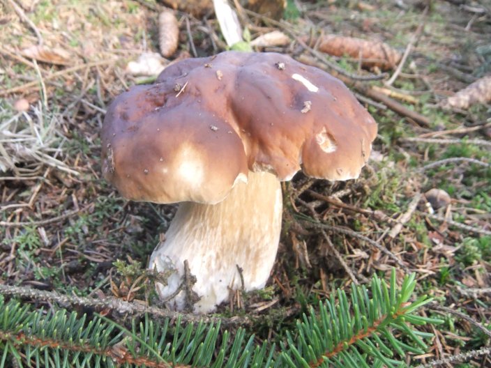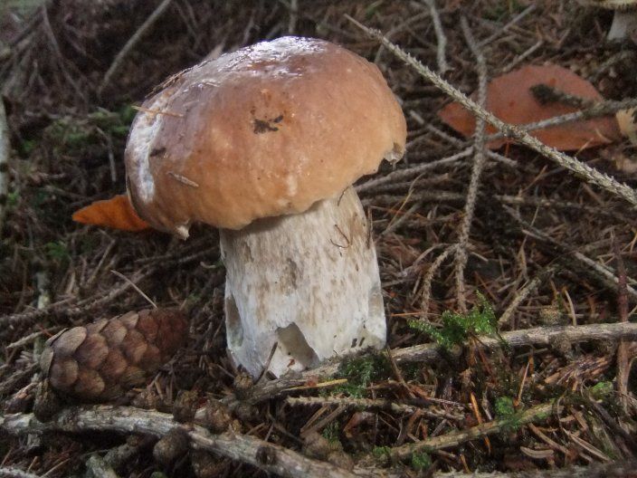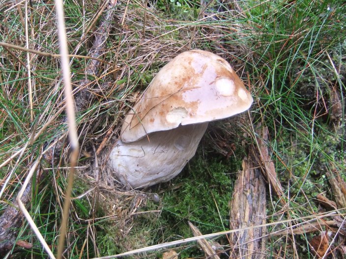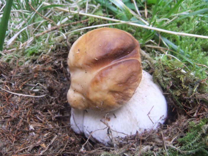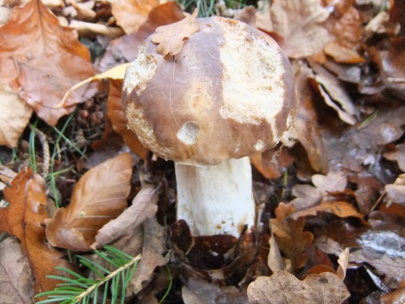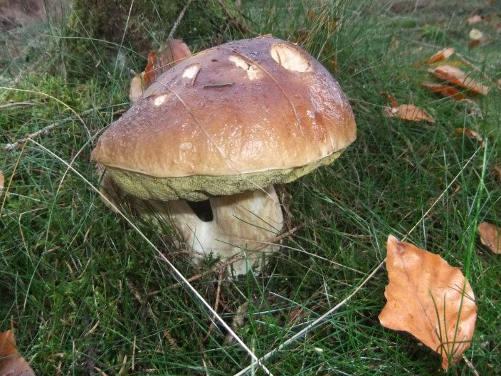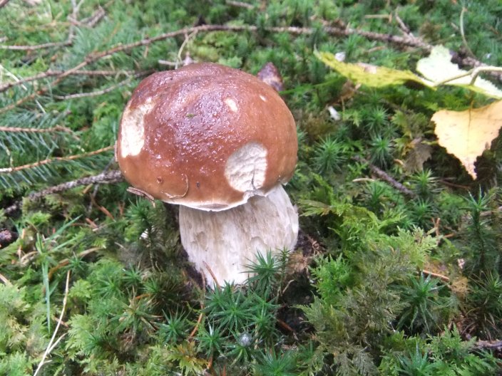 Das dritte Bild ist ein Steinpilz, leider weist der Hut zwei von Schnecken angefressene Stellen auf.