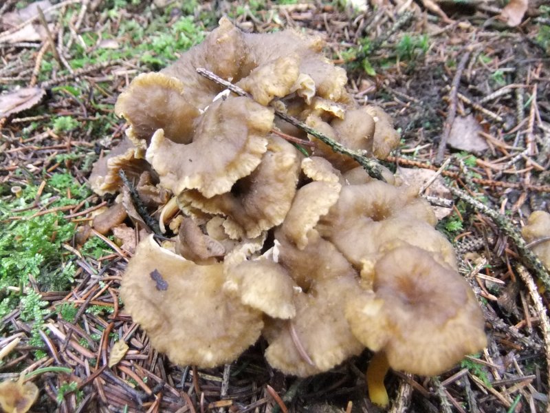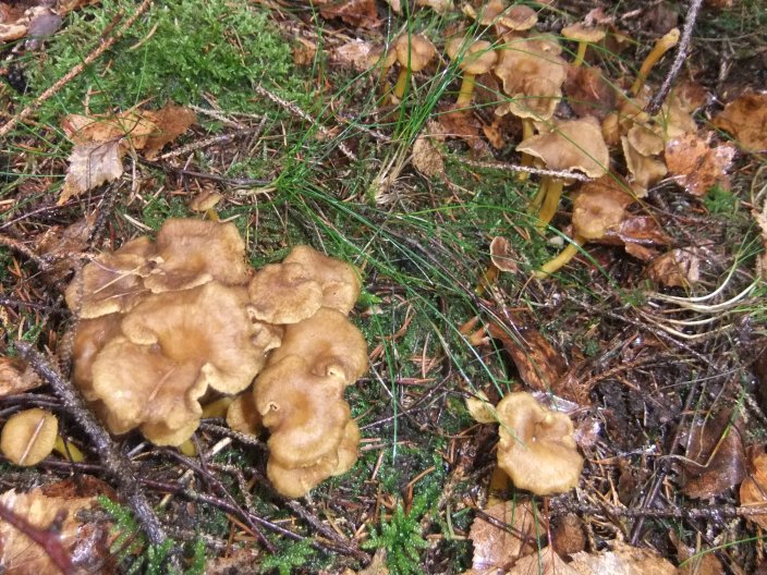 Das erste Bild sind Trompetenpfifferlinge. Diese Pilzart kommt gerne gegen Ende des Herbstes, auch wenn es schon kälter ist, es darf nur nicht unter Null Grad gehen, denn sonst bekommen sie Gefrierbrand, von dem sie sich nicht mehr erholen.