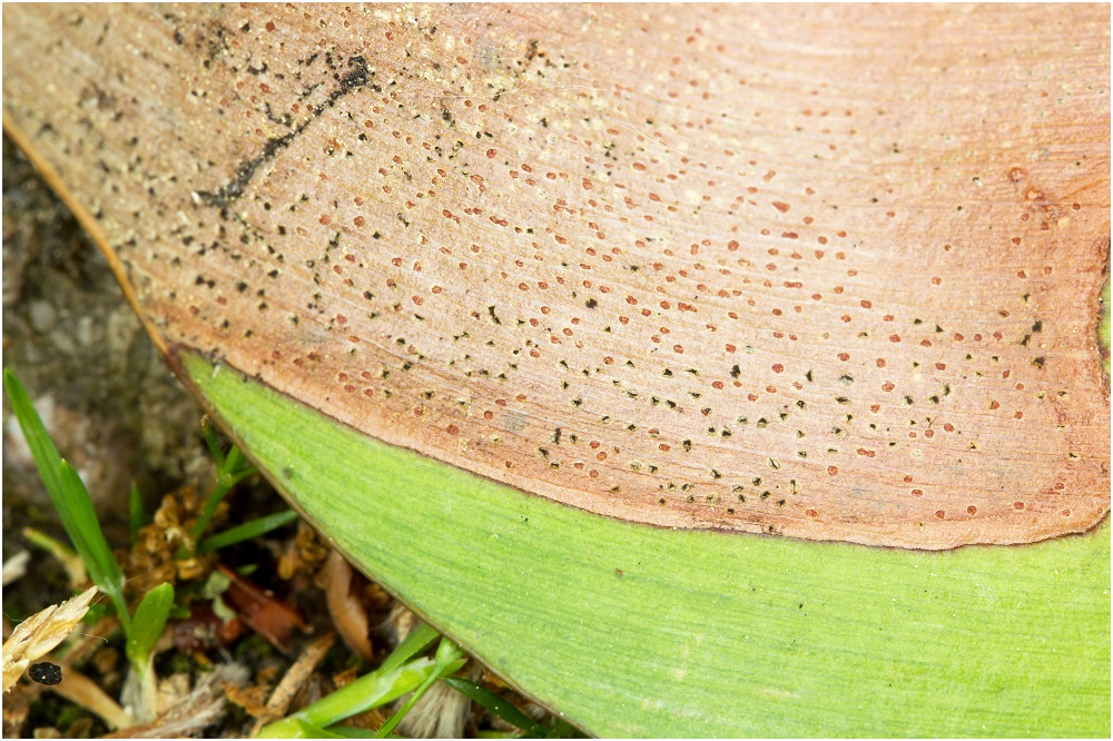 Am 15.05.18 fand ich im Botanischen Garten Bochum , an alten Blättern der Yucca aloifolia , kleine schwarze Punkte.