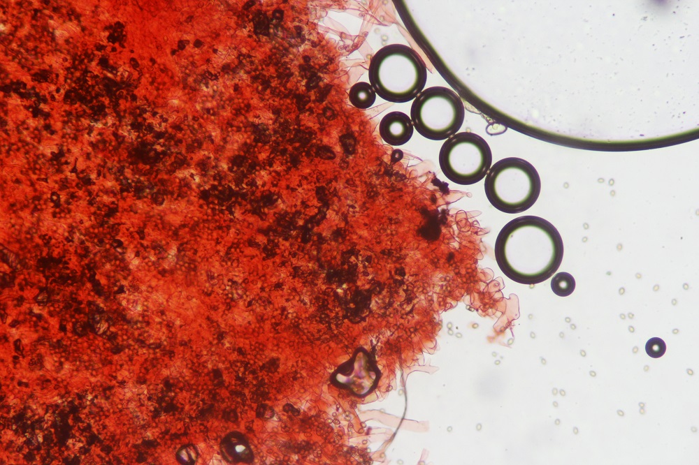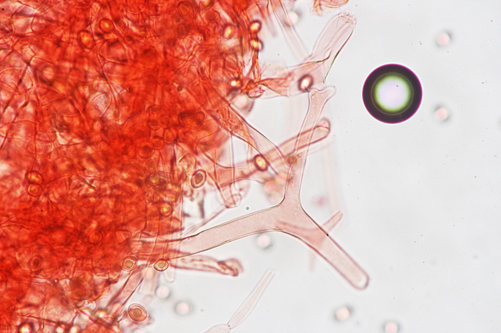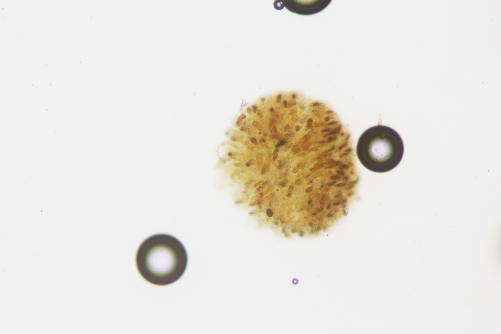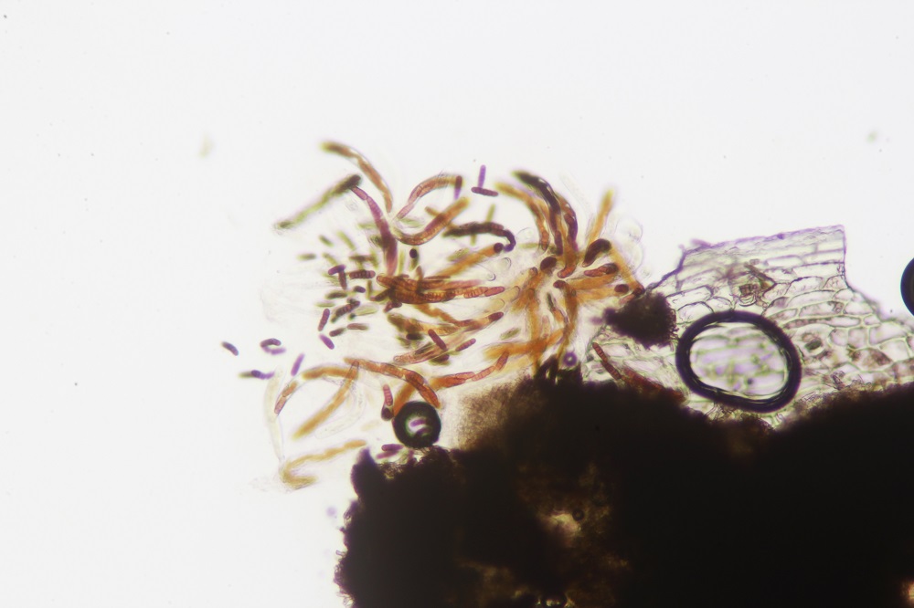 Allerdings tun das bei mir nicht alles Sporen. So sind die unreifen hyalinen Sporen nicht von dieser Reaktion betroffen oder die dunkelbraunen Sporen (ich nehme mal an das sind die ausgereiften Sporen).