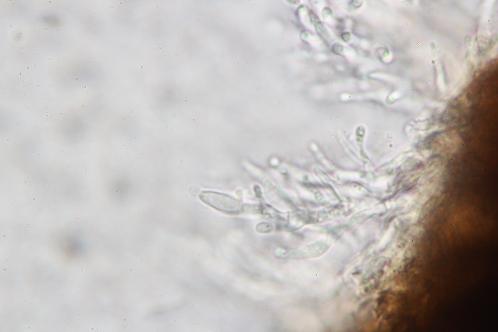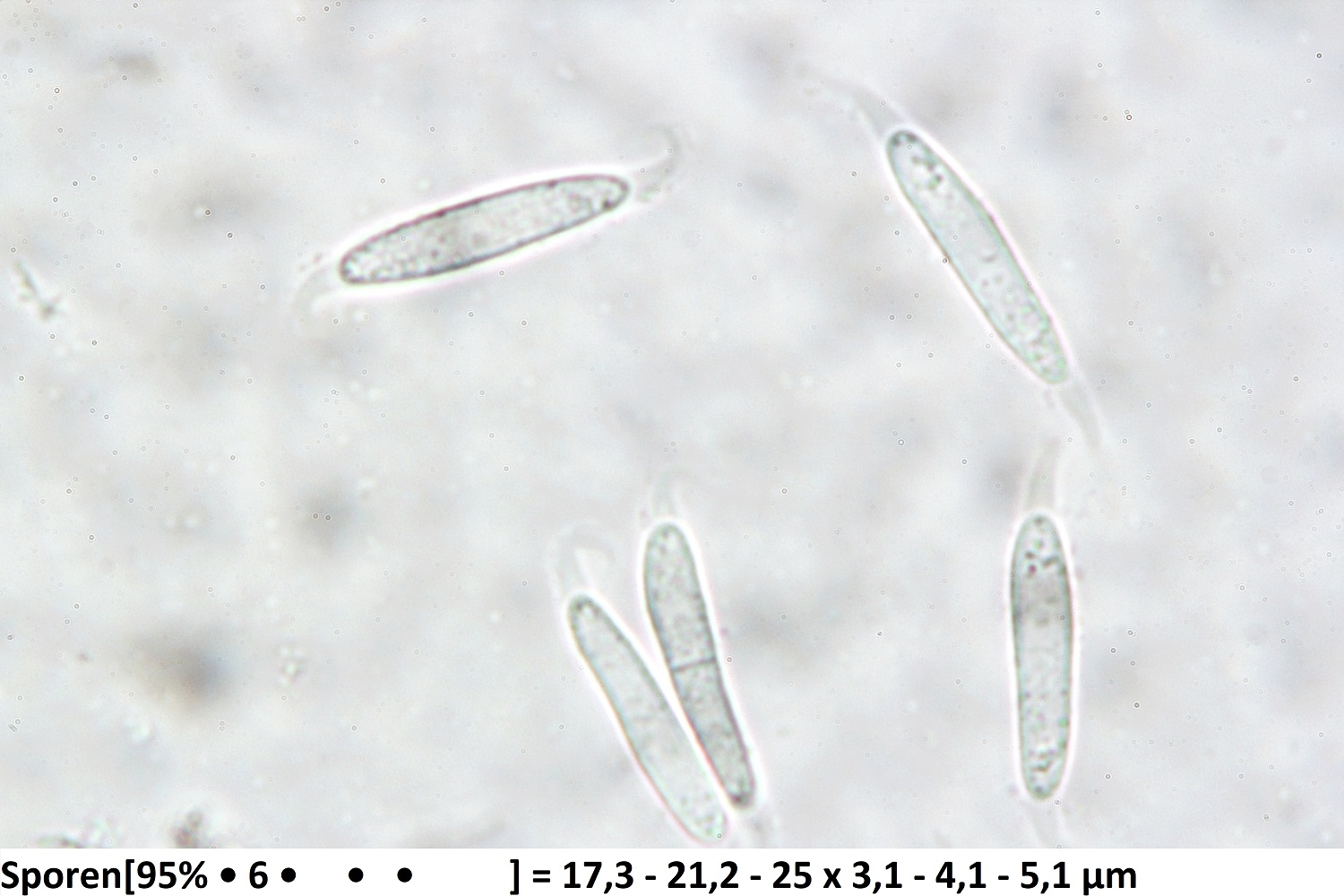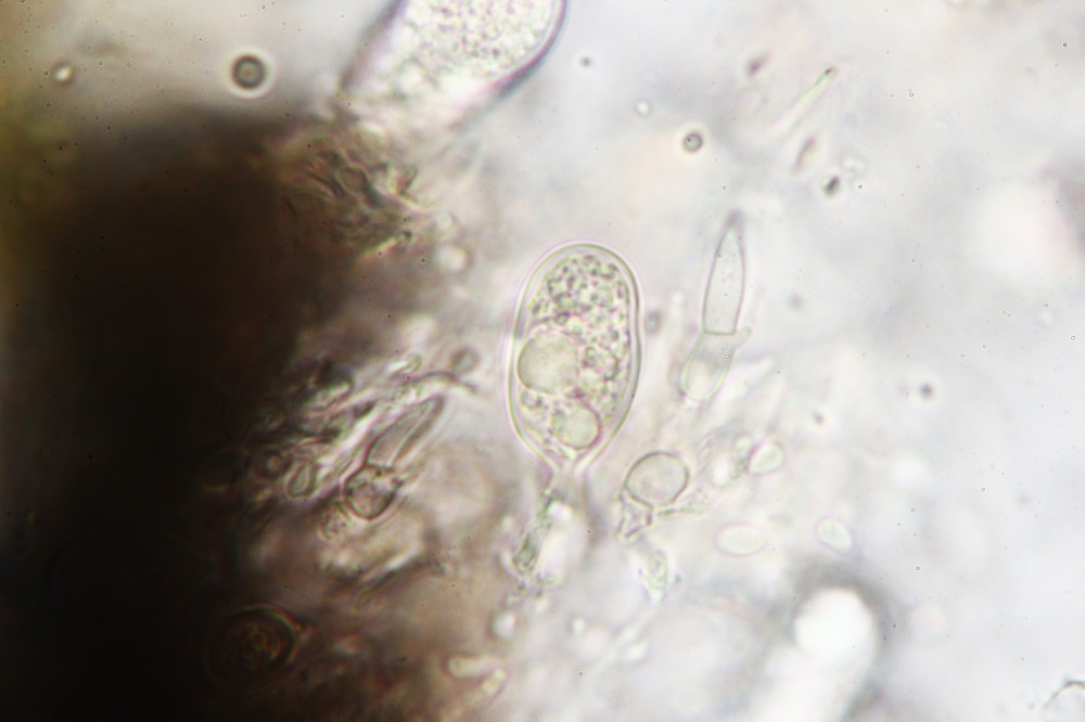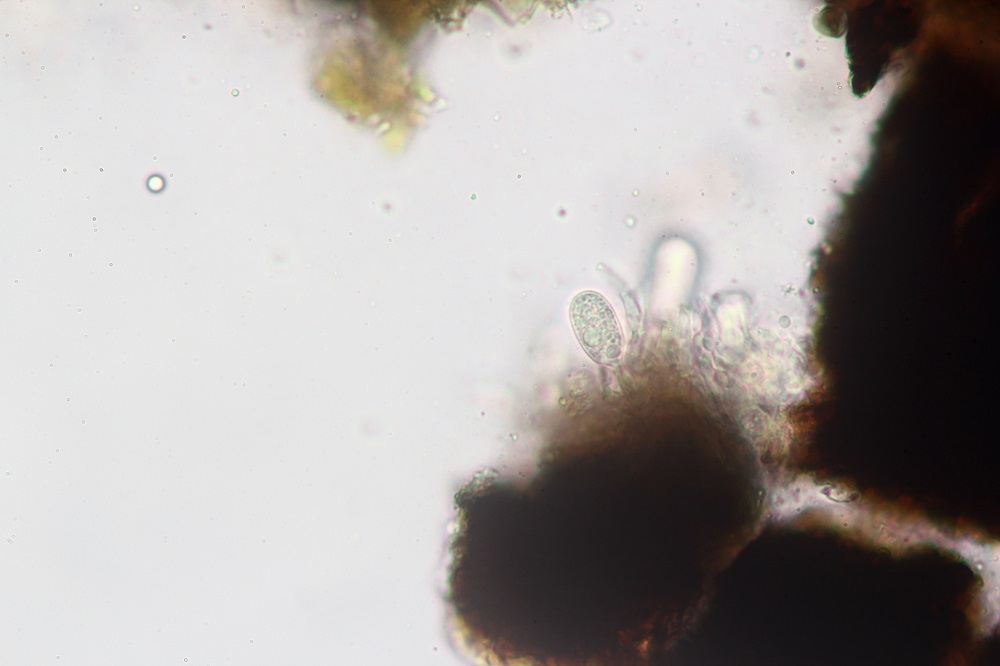 Interessant sind auch die Sporen unter dem Mikroskop, die nicht nur lang sind, sondern auch gekrümmte Anhängsel besitzen.