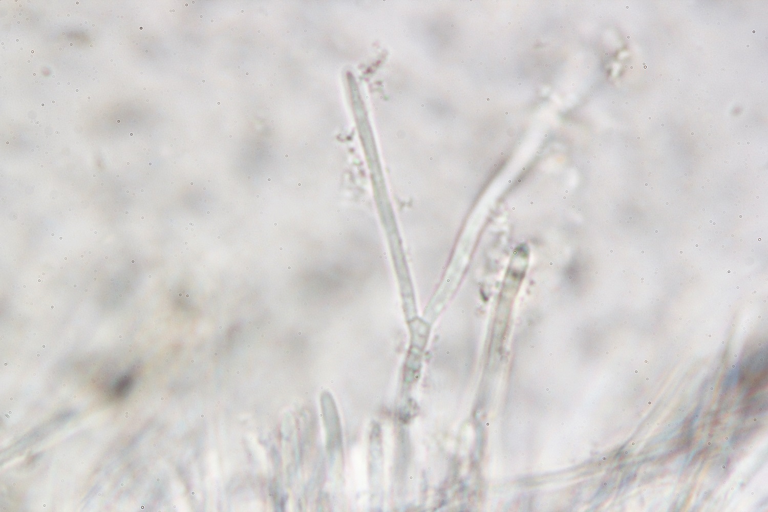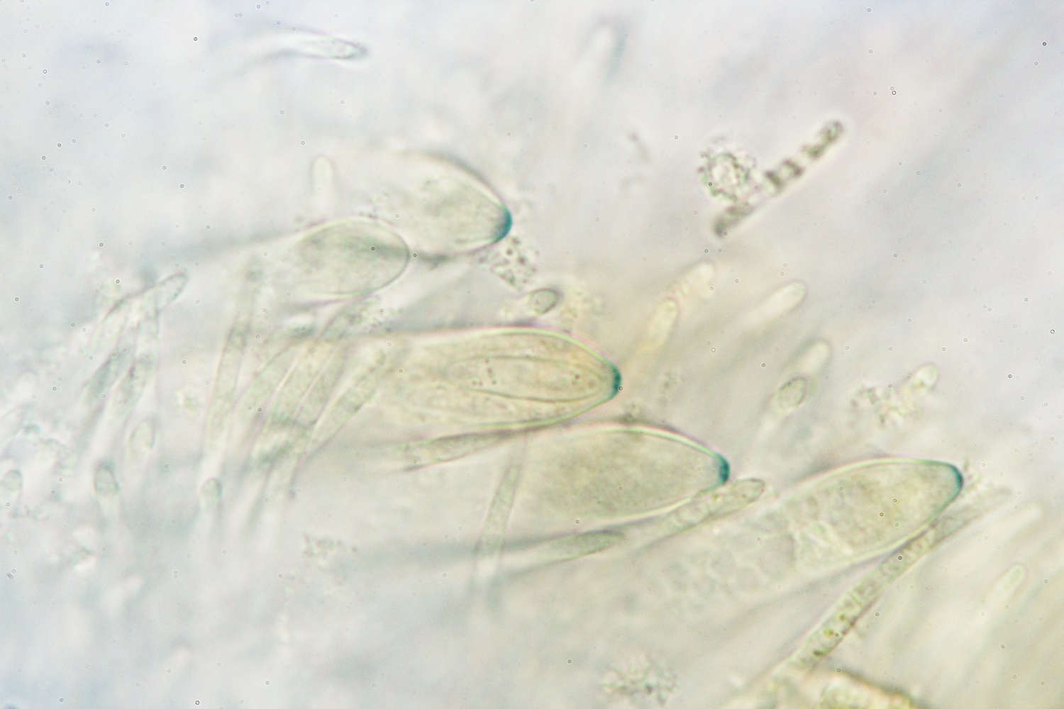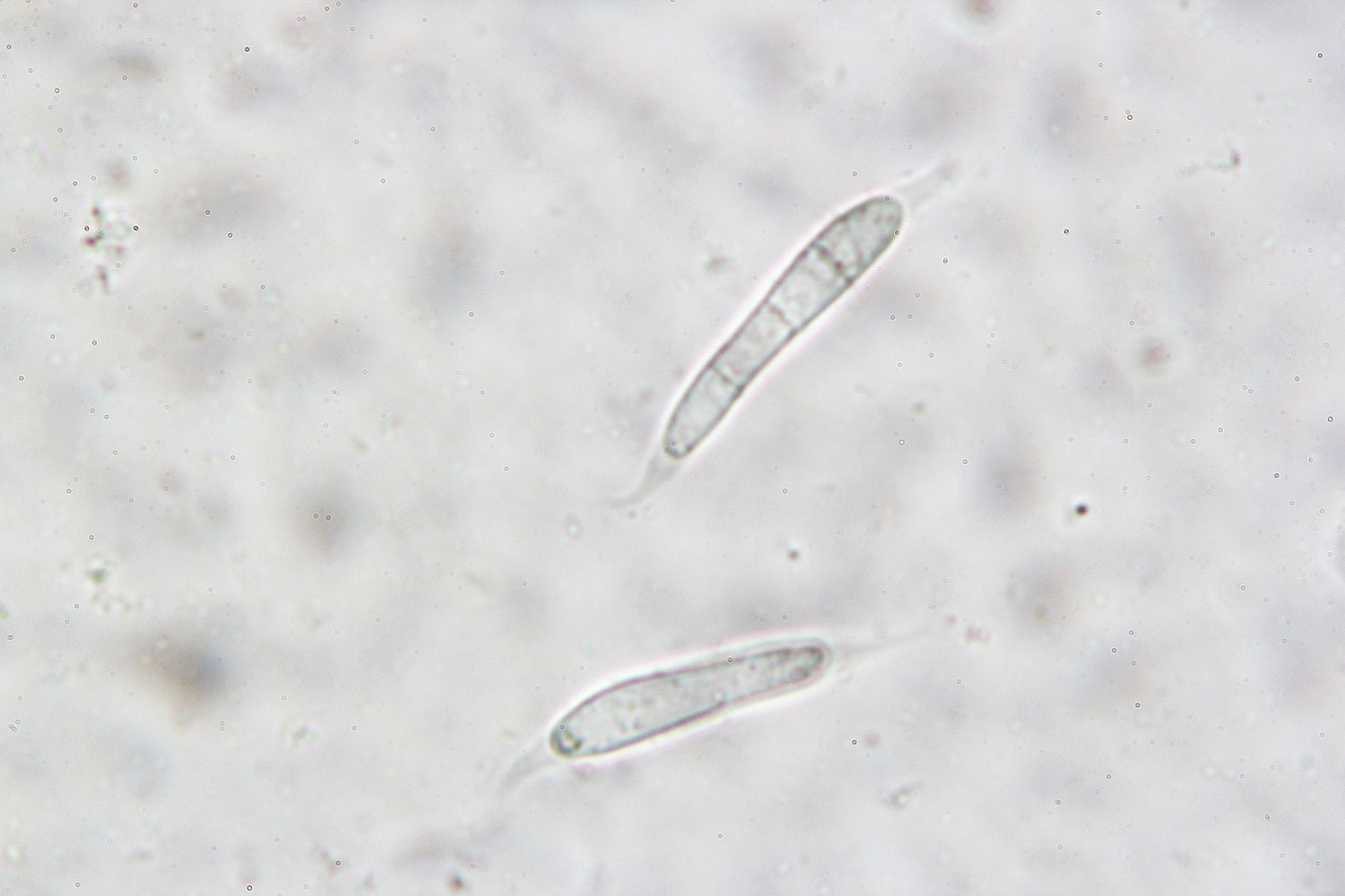 Interessant sind auch die Sporen unter dem Mikroskop, die nicht nur lang sind, sondern auch gekrümmte Anhängsel besitzen.