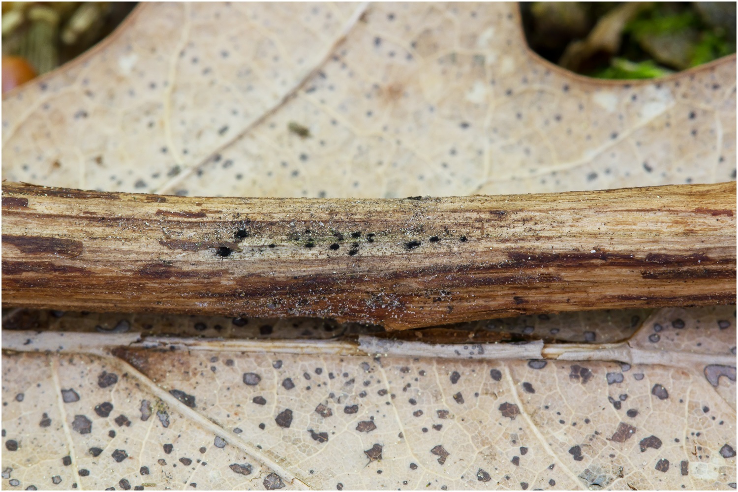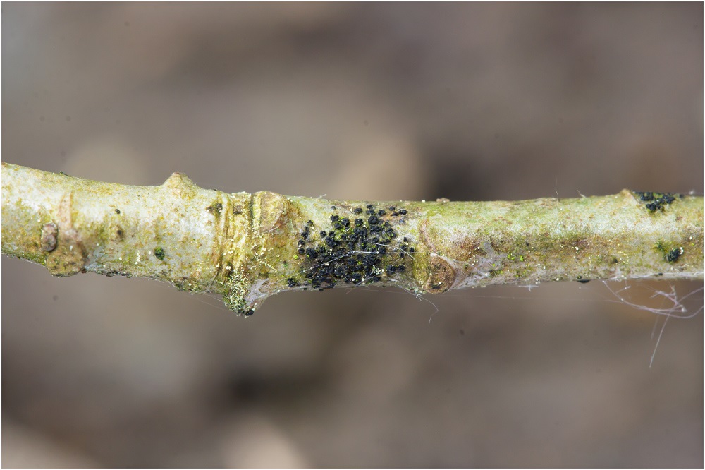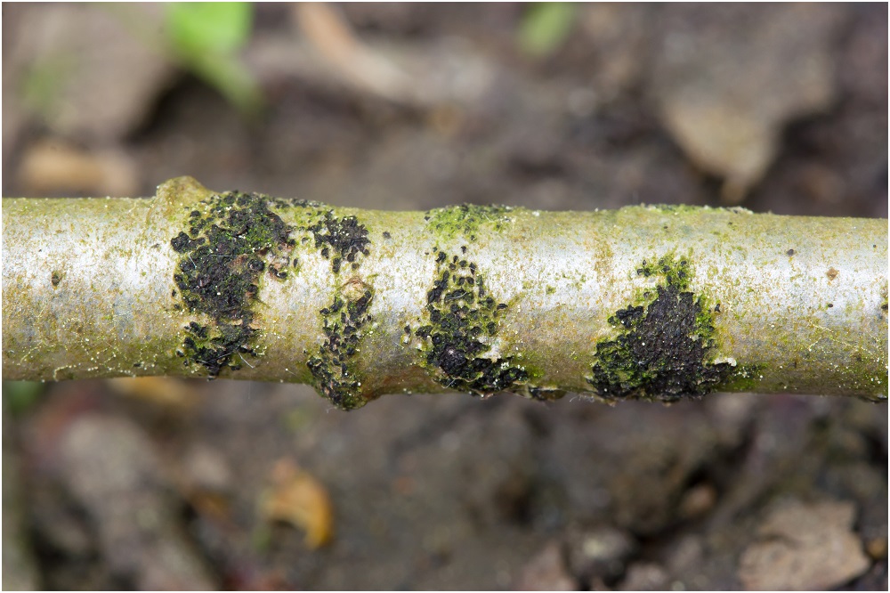 vor 3 Tagen fand ich einen "schwarzen" Belag auf einem Stöckchen von wahrscheinlich Quercus rubra oder Fagus sylvatica (Tendenz zu Q. rubra).