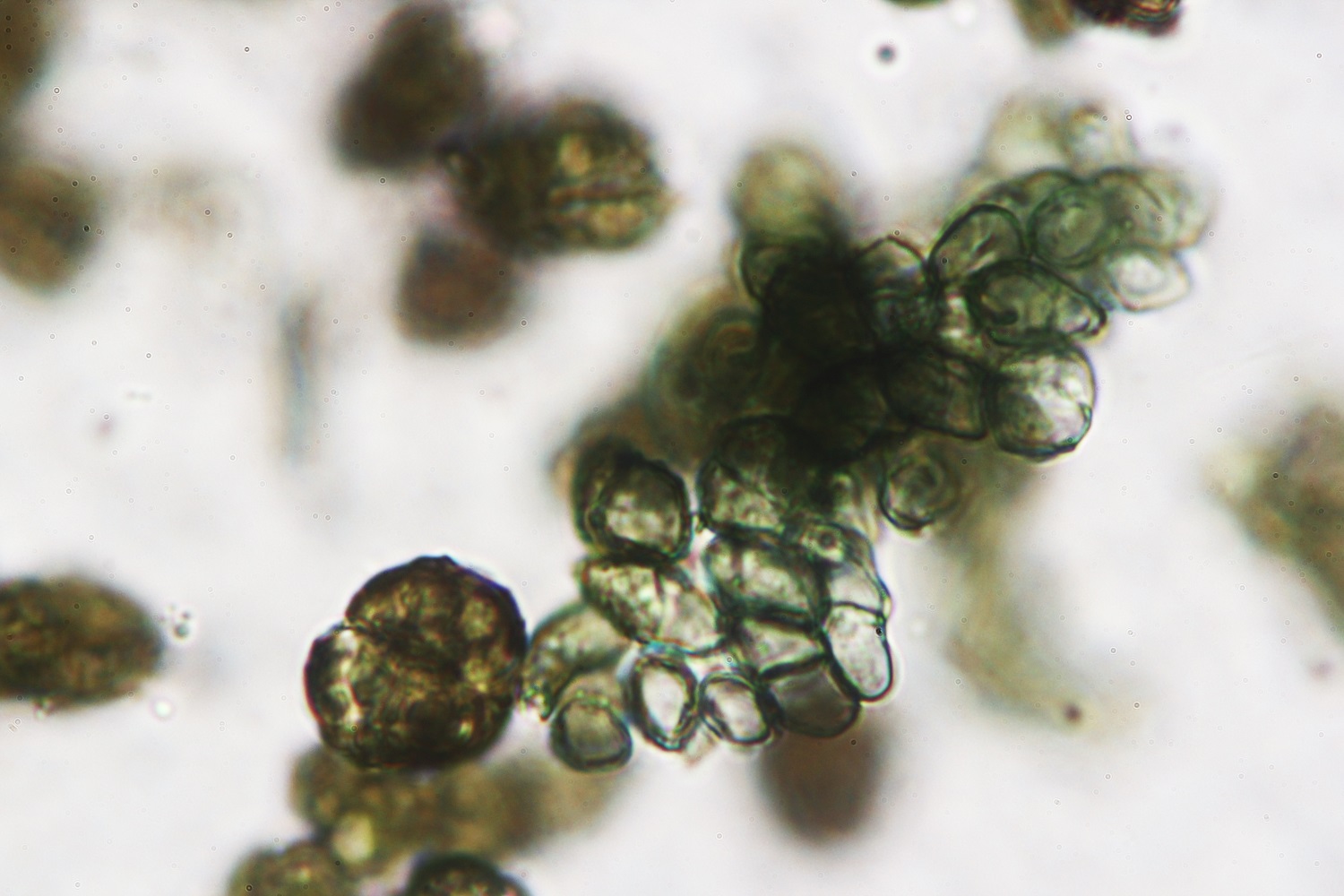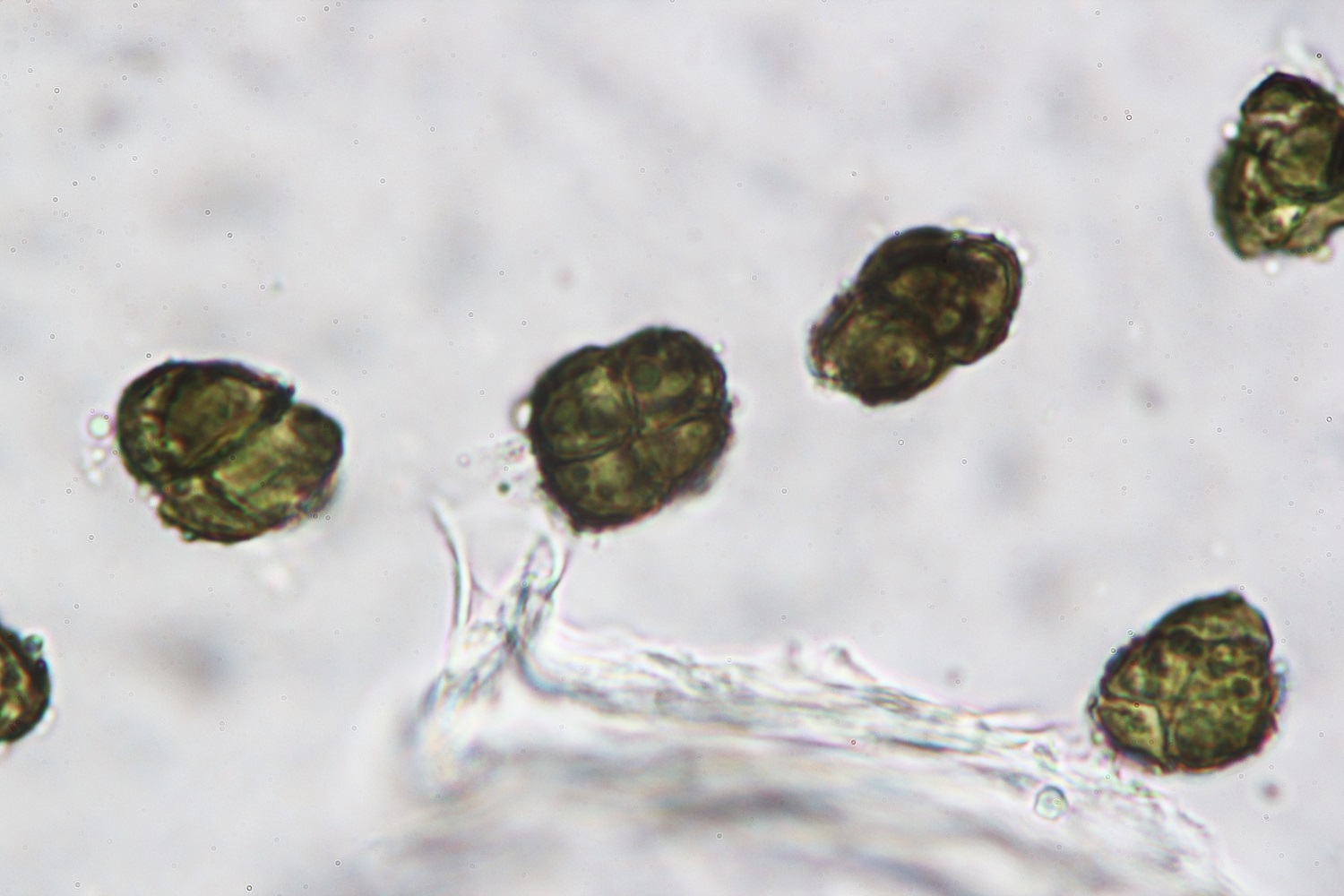 Unter dem Mikro hat sich der schwarze Belag als grüne Konidien entpuppt. Diese Konidien haben eine warzige Außenschale und sind 15-18 x 10-15 Mikrometer groß (4 Messungen).