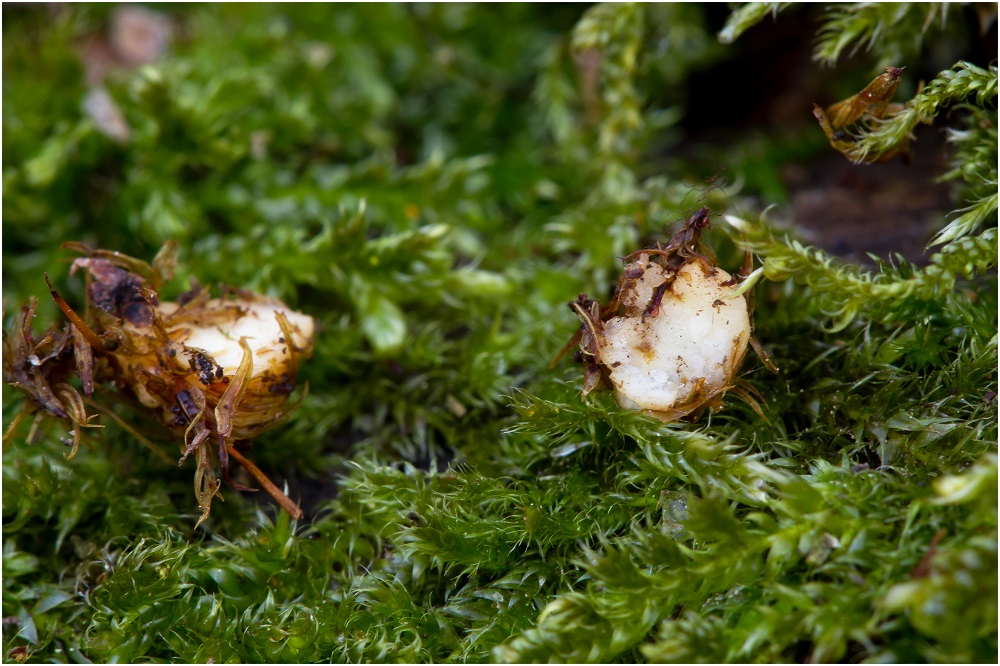 7. Die weiße Masse ist eine Isaria friesii in ihrer Entwicklungsphase, rechts daneben befinden sich Überreste von der Außenschale des Pyrenos