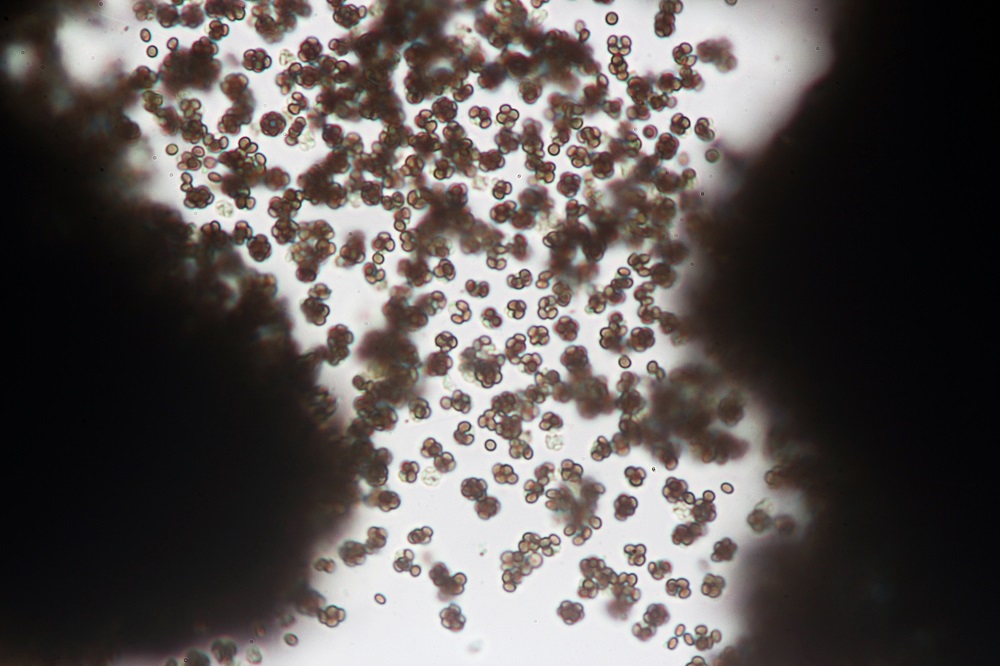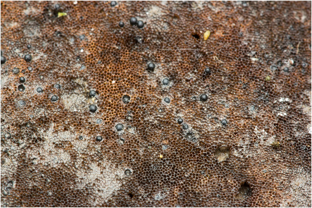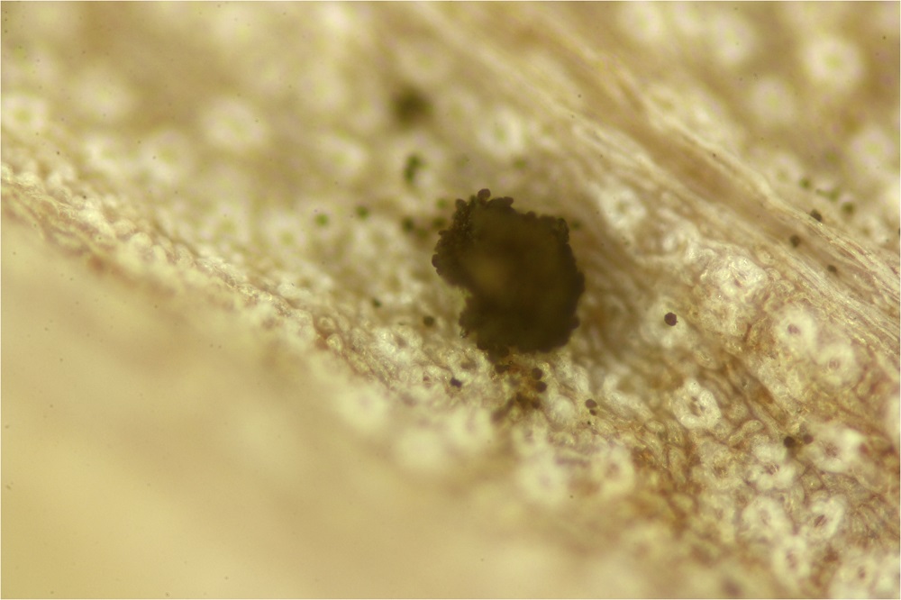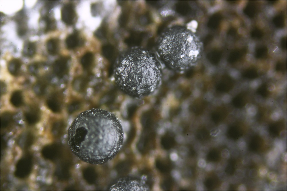 Dort wuchsen an der Unterseite, direkt an den Poren, kleine schwarze Kügelchen.