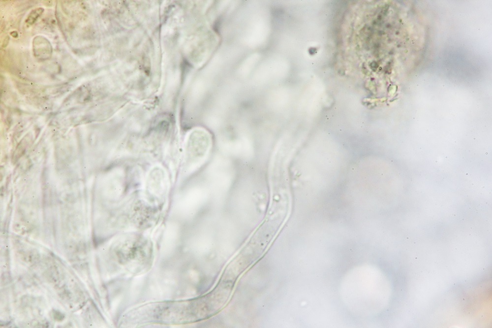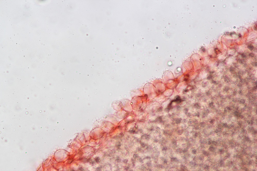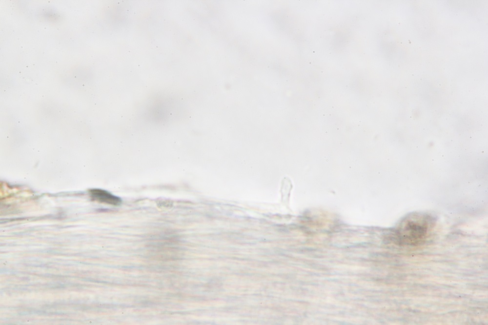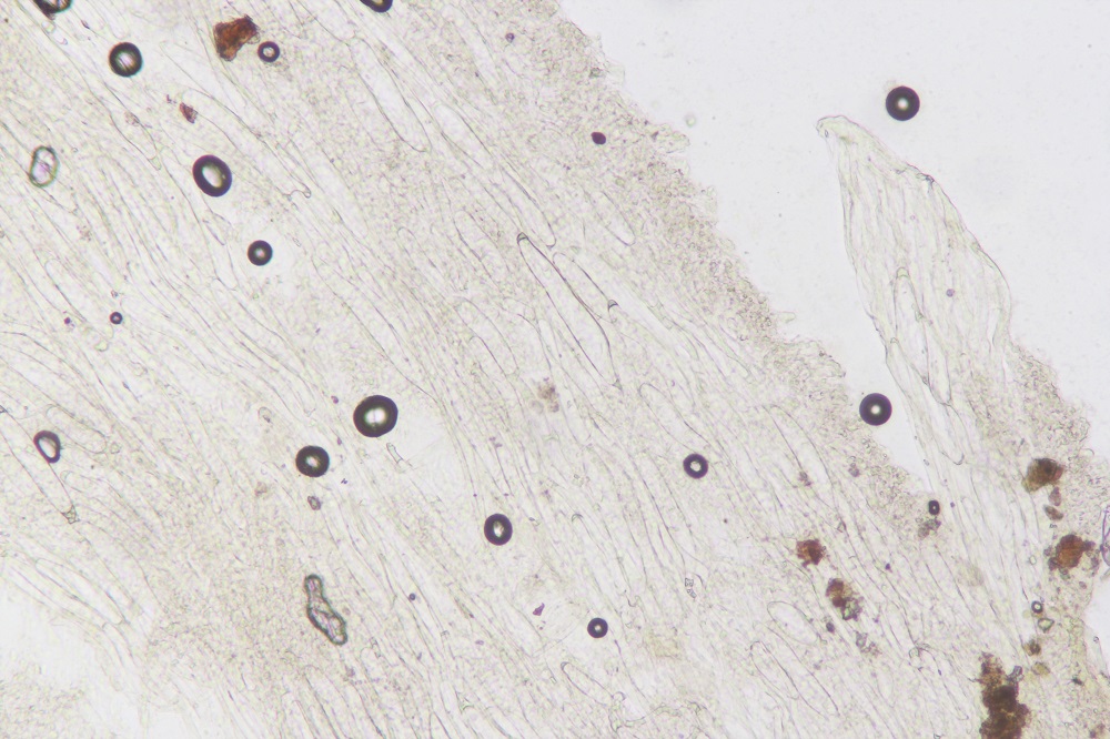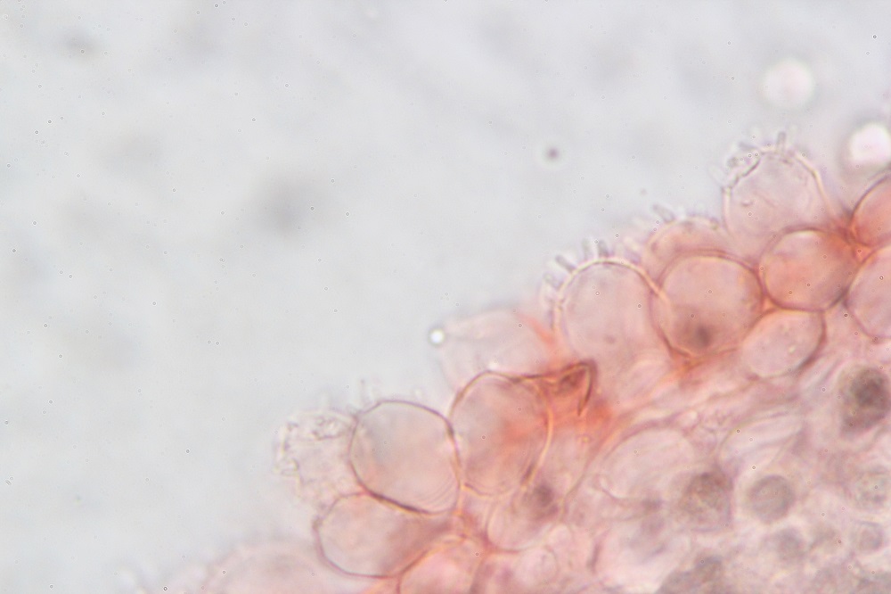 Was ich an diesem Pilz nicht fand, waren die Kaulozystiden und die "Basalscheibenzystiden" (Basal disk cystidia). Man kann aber auf den Makrobildern sehen, dass zumindest die Kaulozystiden vorhanden sind.Endzellen der Hutdeckschicht