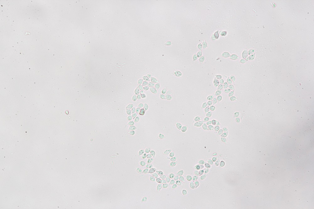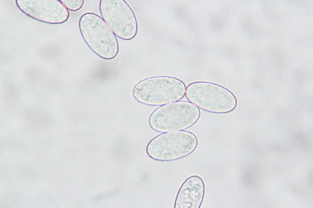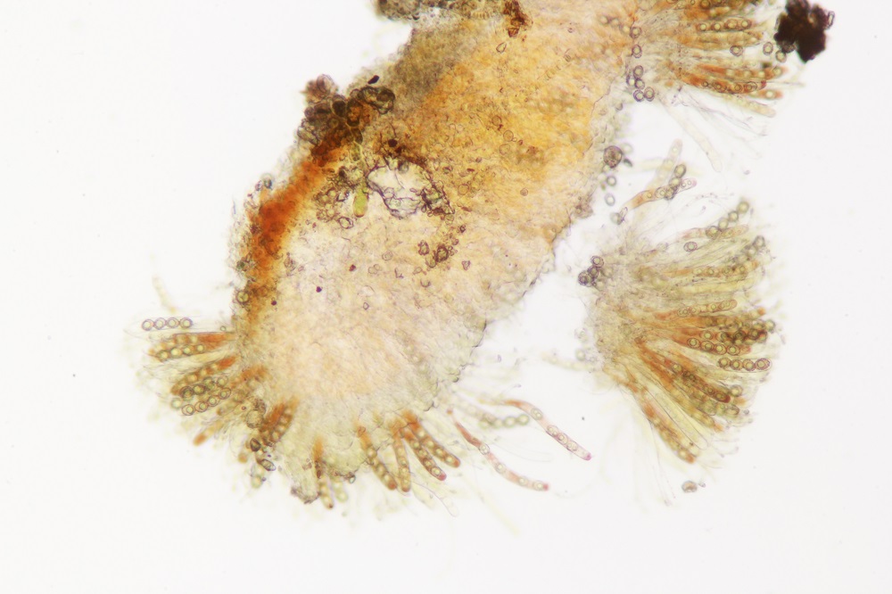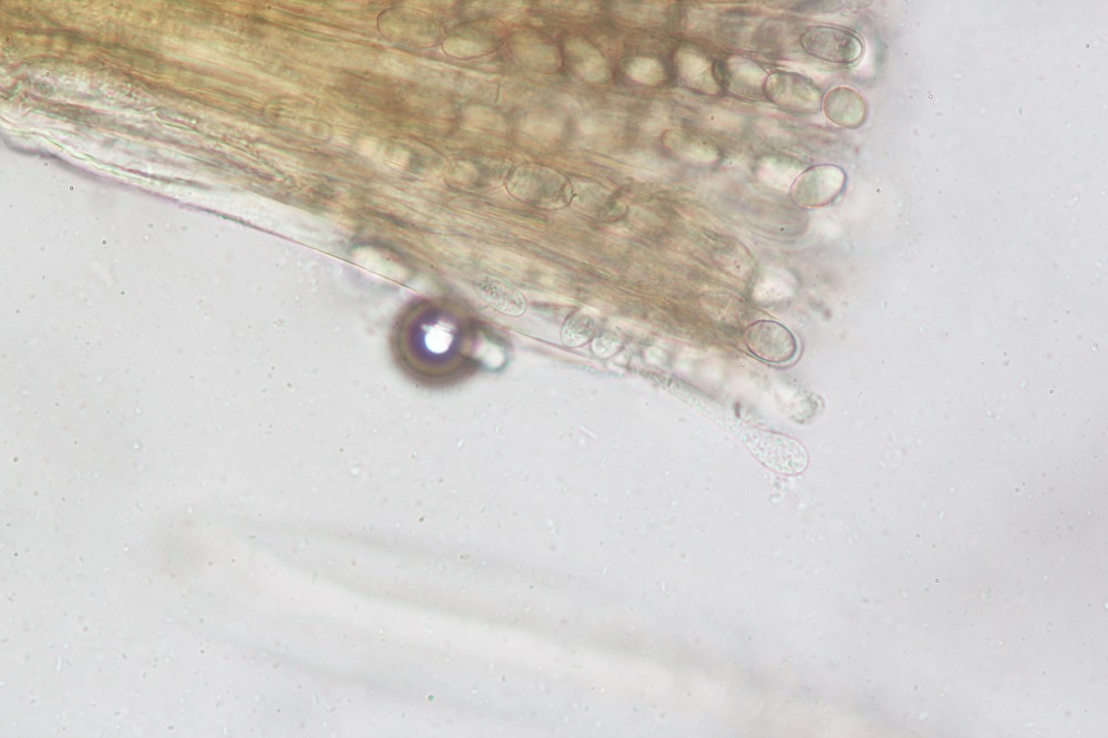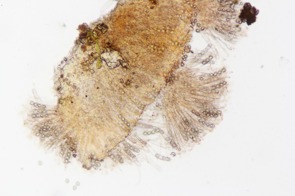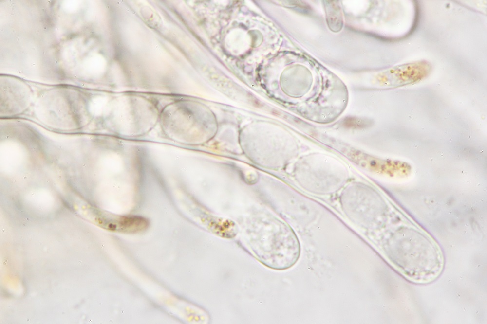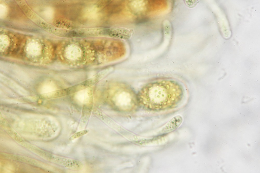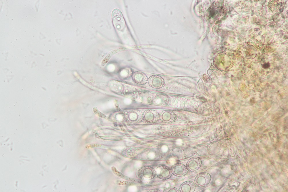 Winzige Asci, mit Sporen von 5-6 Mikrometer in der Länge und in Lugol verfärbt sich an der Ascusspitze 2 blaue Striche.