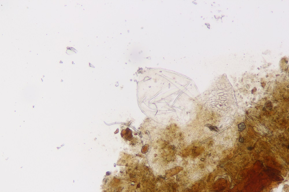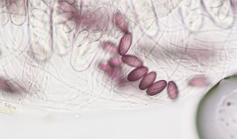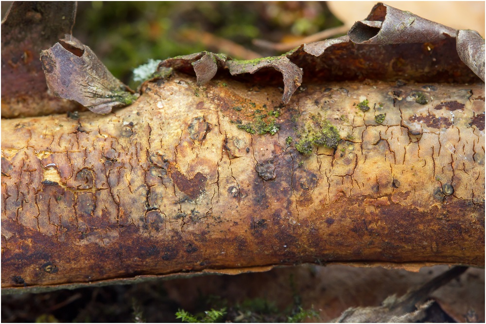 Es handelt sich hierbei um eine Vuilleminia mit einem Befall von Deltopyxis triangulispora. Allerdings konnte ich keine Apothecien von Deltopyxis triangulispora finden, dafür aber einiger dieser Sporen und Konidienformen.