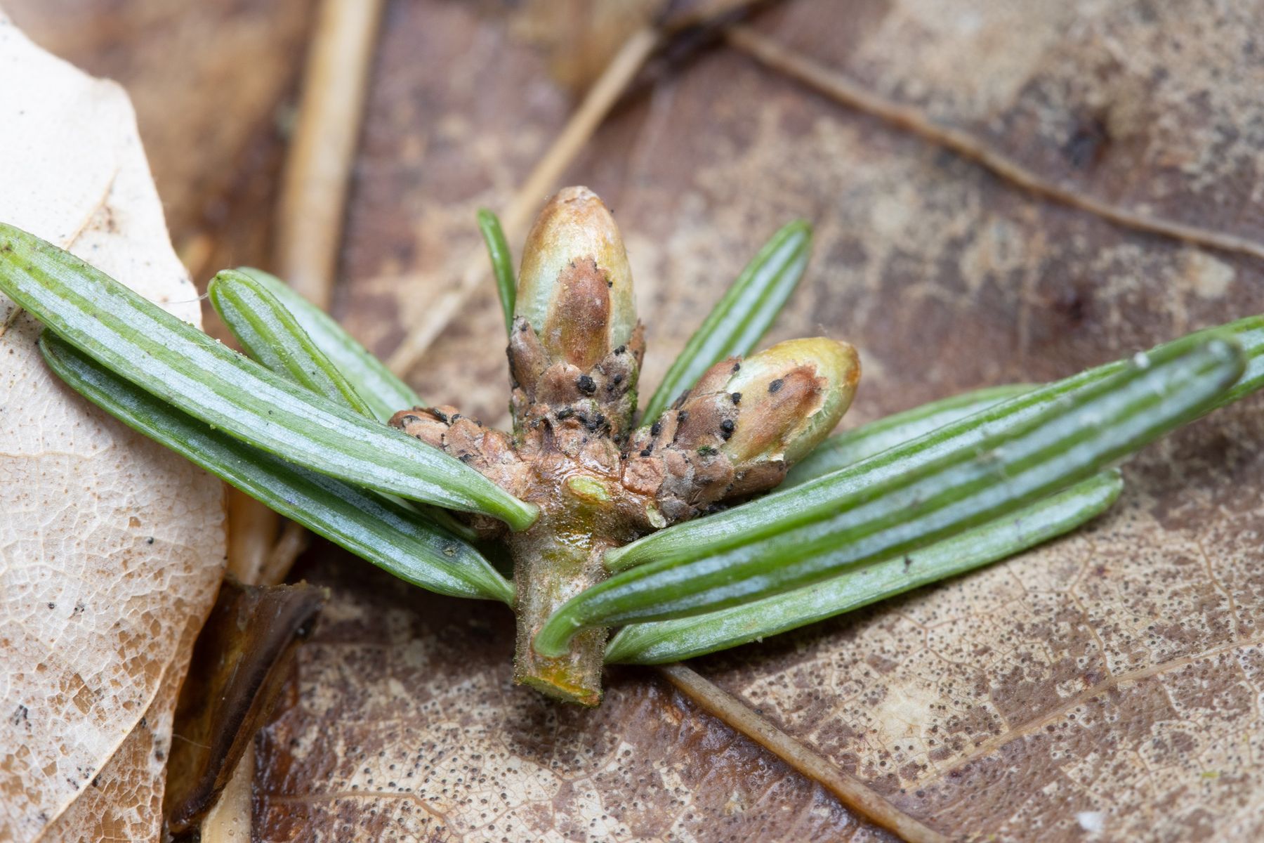 Normalerweise sollen Nadeln befallen werden, aber hier scheint es auch die Blüten zu betreffen.