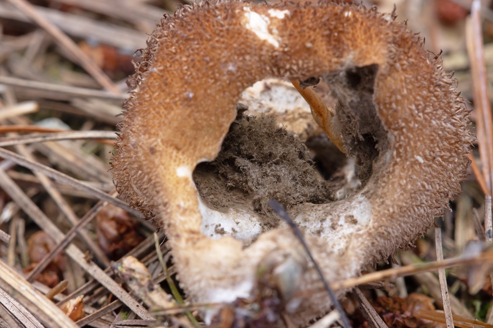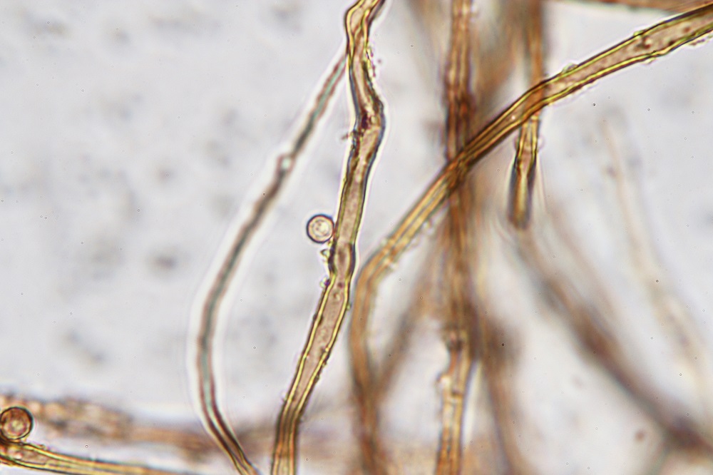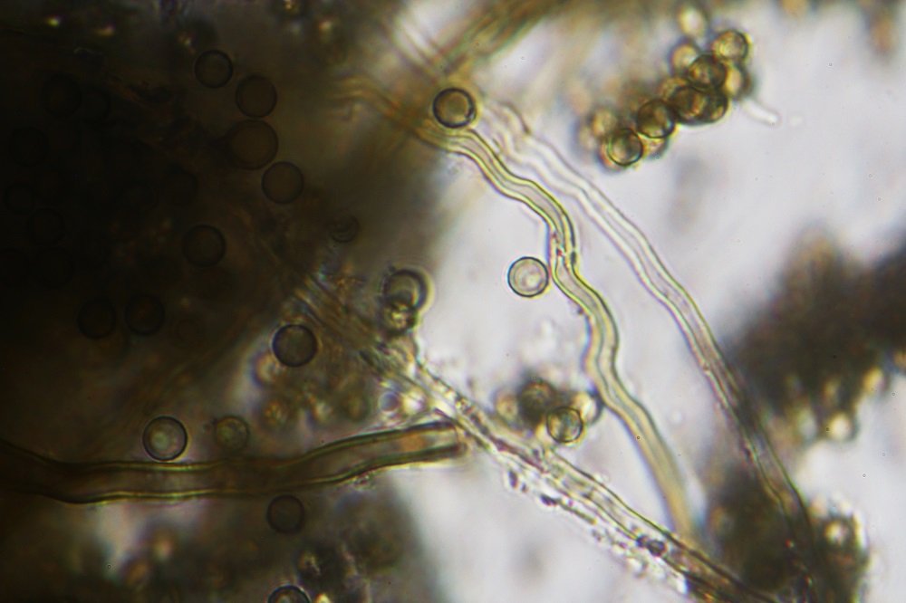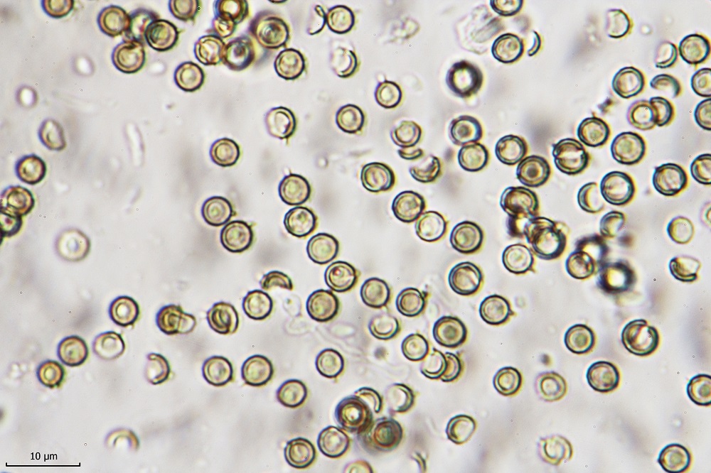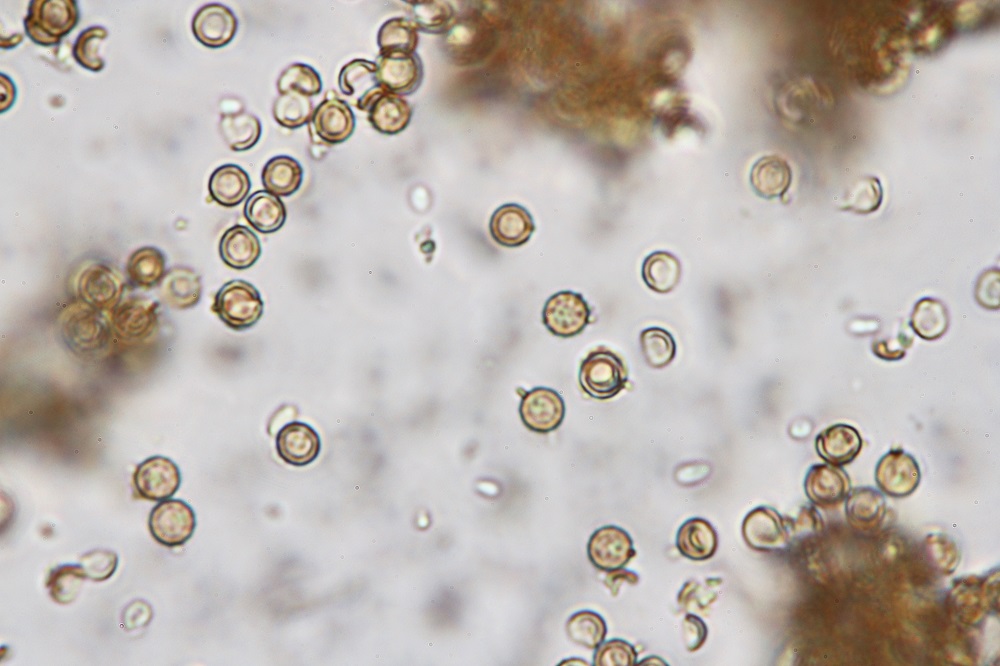 Ein Sporenabwurfpräparat hat nicht geklappt, da der Pilz zu wenig Sporen abgeworfen hat, aber die Sporen sind entweder weiß/ocker/gelb, aber nicht dunkel oder anders farblich gefärbt.