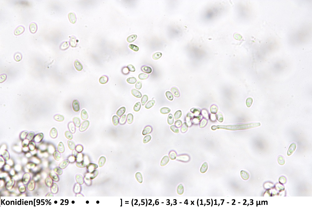 Die Sporen sind rundlich 6-7 x 5,5-6µ