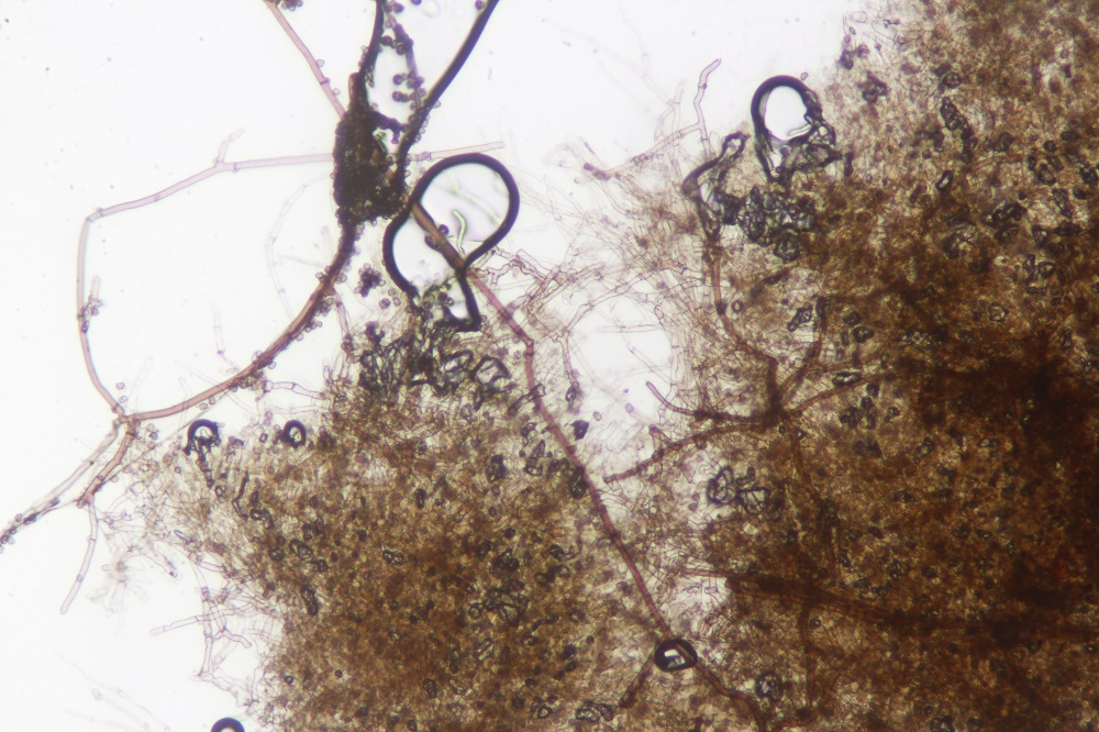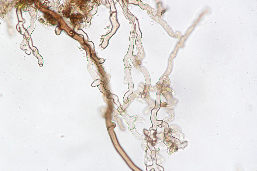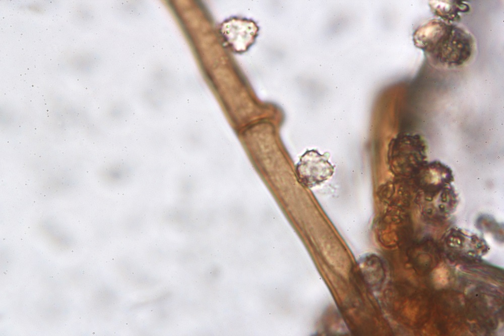 die braunen Hyphen scheinen keine Fremdhyphen zu sein. Sie sind erst braun und werden dann nach und nach hyalin.
