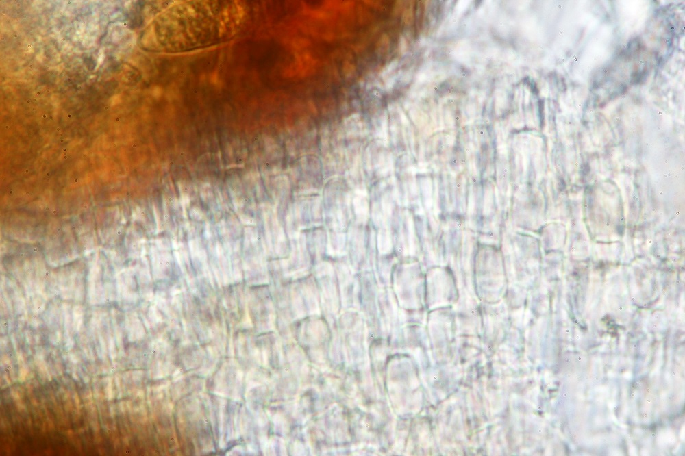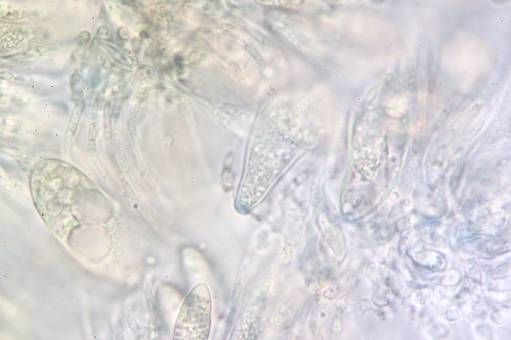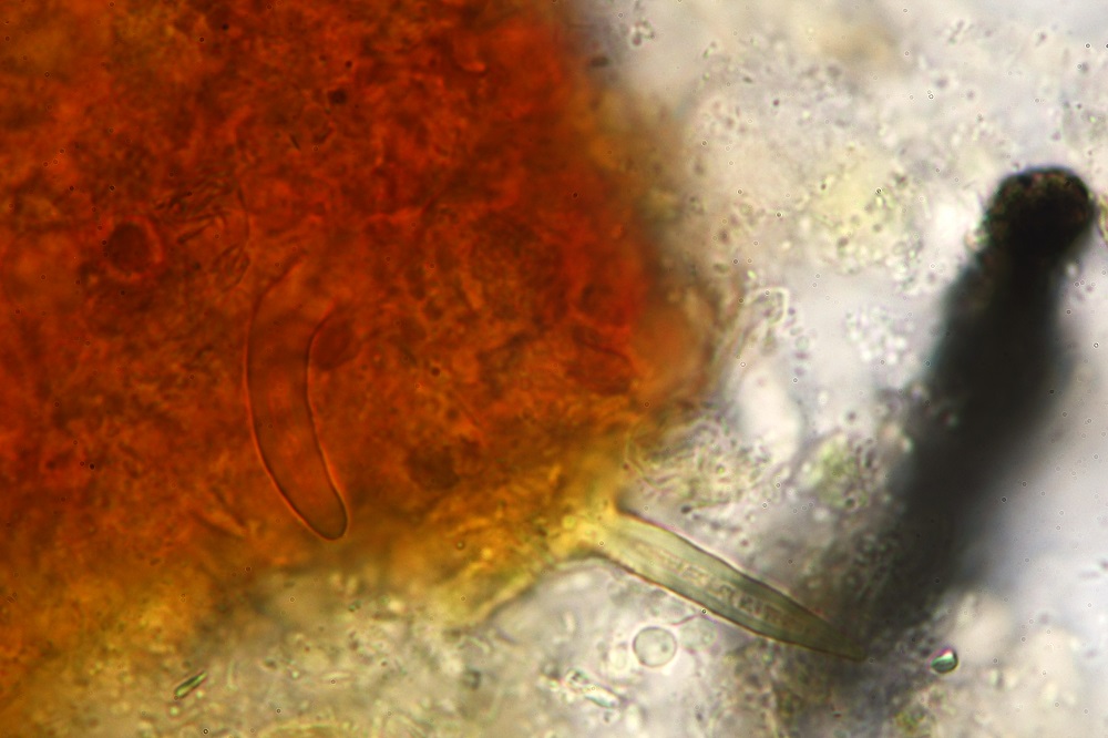 Dieser Basidiomycet hat am Stiel zahlreiche Kaulozystiden, am Hut Pileozystiden (sehen gleich aus wie die Kaulos) und durch Zufall konnte ich eine Ansammlung von Sporen entdecken.