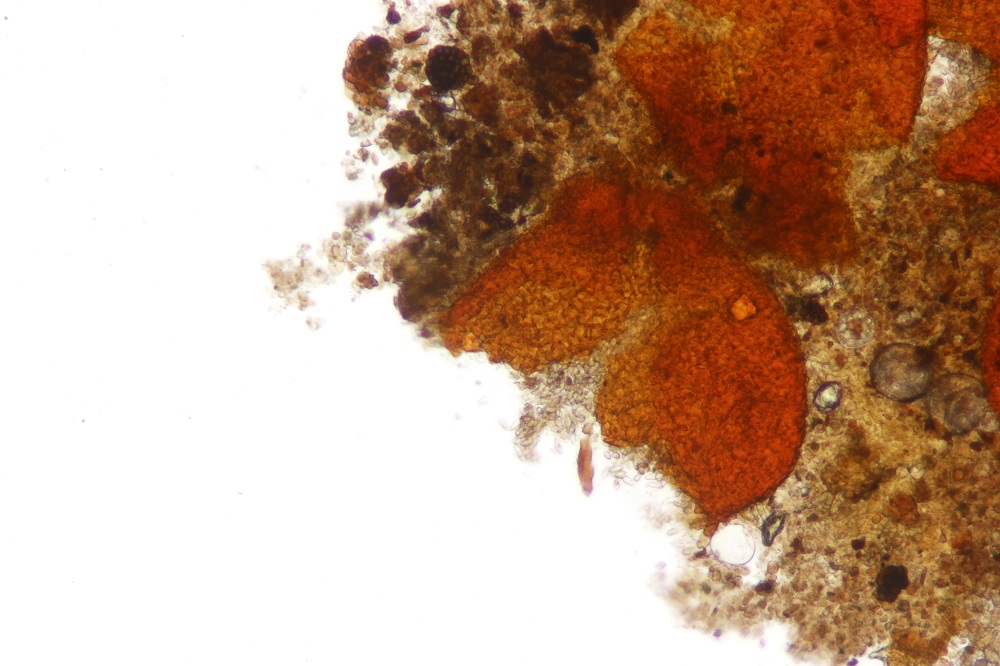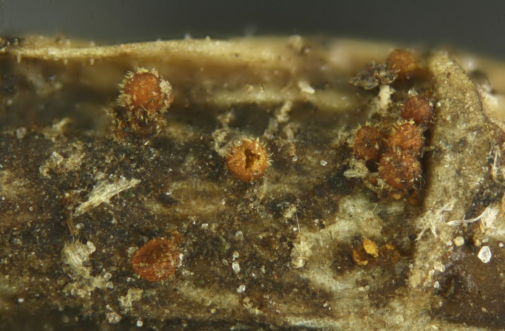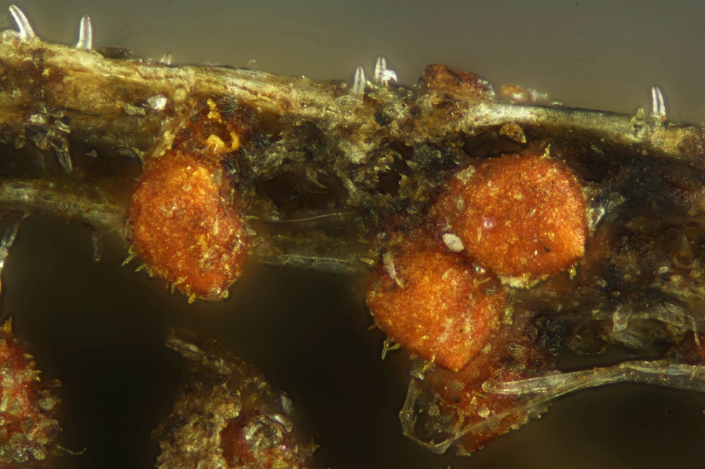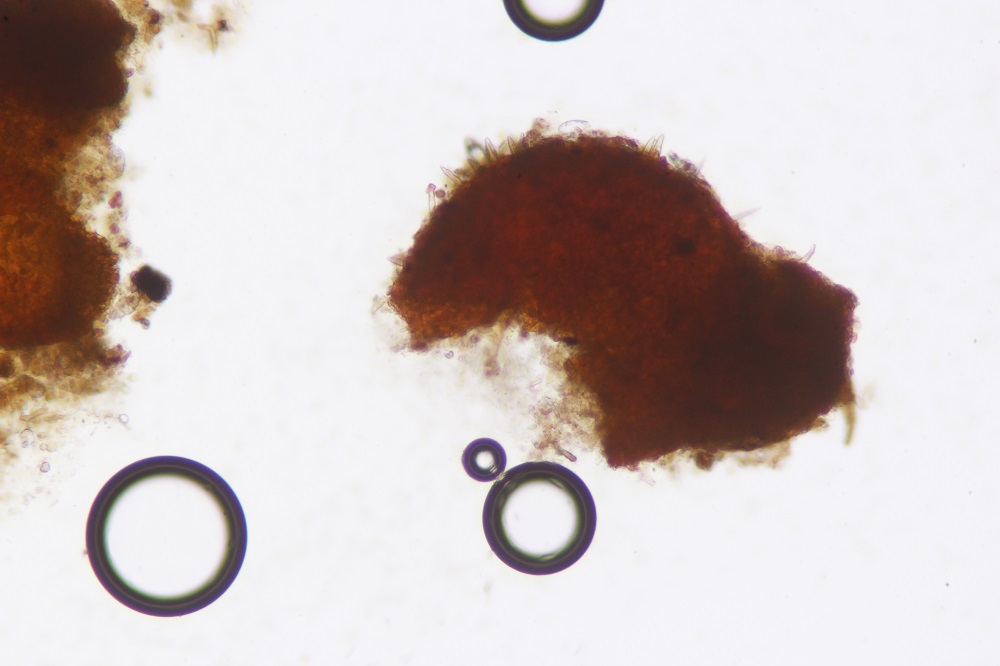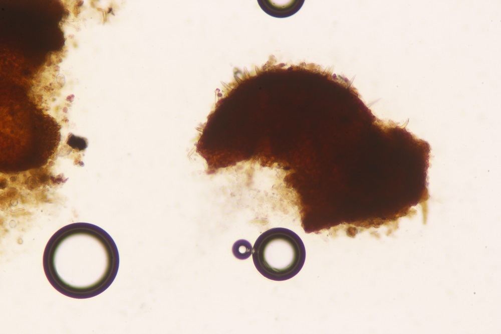 Allerdings gab es unter dem Mikroskop eine Überraschung, denn die roten Pünktchen waren voller Konidien und es gab sogar 2 verschiedene Arten von Konidien.