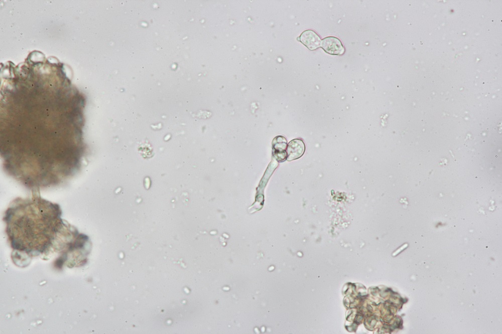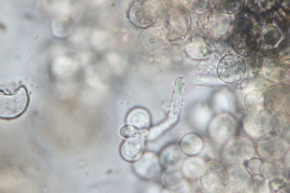 Zurück zu der bulbils-like Anamorphe. Ich glaube das ist eine Anamorphe von einem Basidiomyceten, weil ich bei weiteren Untersuchungen Hyphen finden, woran die Kugeln gebildet wurden.