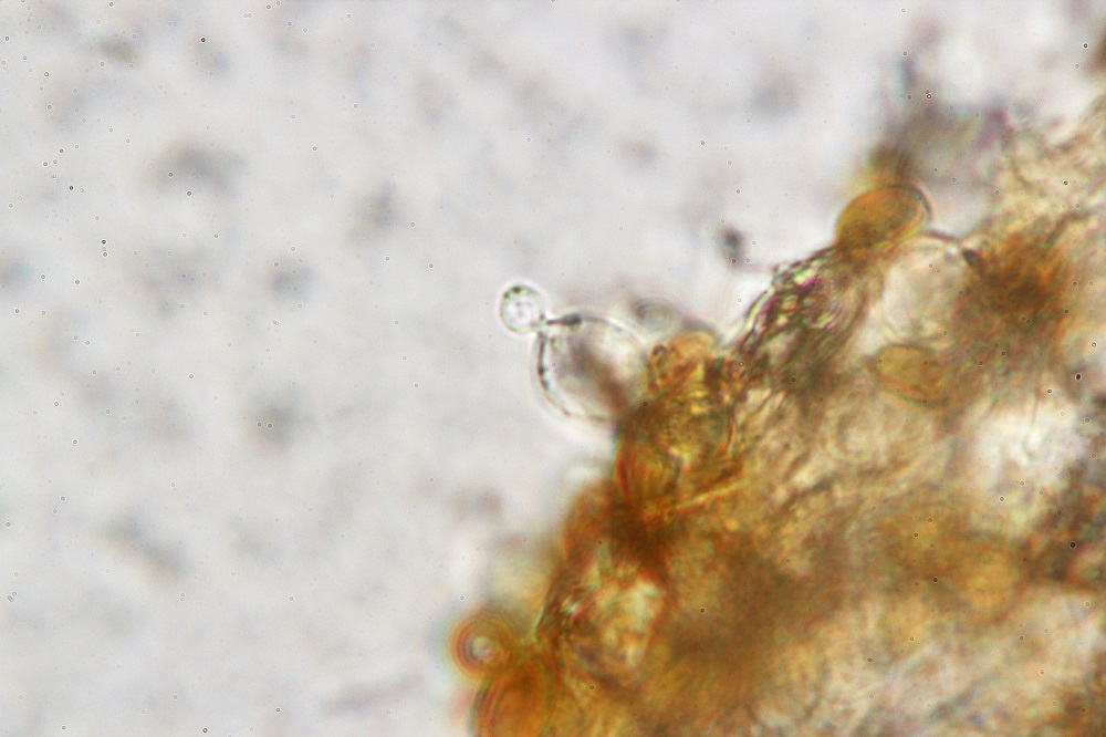 Ich gehe davon aus, dass es sich um eine Art aus der Sektion Conocybe handelt, also mit nahezu ausschließlich lecithiformen Kaulozystiden. Ein notwendiges makroskopisches Merkmal ist die Stielbasis. Ich glaube zwar nicht, das es sich um eine der Arten mit wurzelndem Stiel handelt, aber es gibt Arten mit einem kleinen Knöllchen an der Stielbasis und irgendwann im Schlüssel wird danach gefragt. In diese Gruppe sollte man auch immer die NH3-Reaktion durchführen, da sie zumindest bei stark positiver Reaktion sehr hilfreich ist.
