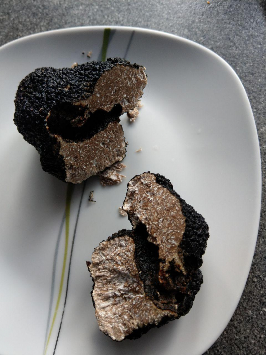 Was die kleineren Trüffeln im September betrifft. Nun, es könnte eine andere Art sein, eine bessere sogar. Oder es waren nur kleinere Exemplare. Die Fruchtkörper sind halt nicht genormt. Es könnte aber auch bedeuten daß der Fruchtkörper am Vergehen war? Das ist aber nur eine Überlegung. Ich habe keine Erfahrung mit Trüffeln und weiß nicht ob sie wirklich schrumpfen im Alter. Eine Angabe zur Konsistenz, verglichen mit deinem jüngsten Fund könnte vielleicht hilfreich sein. Weicher? Härter? Farbe im Schnitt anders?