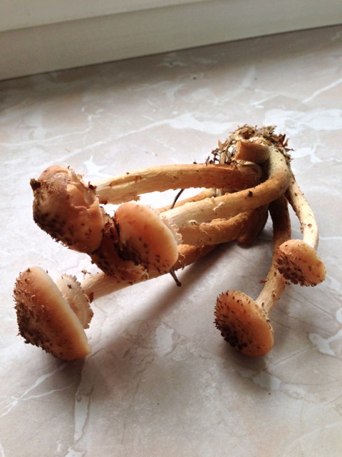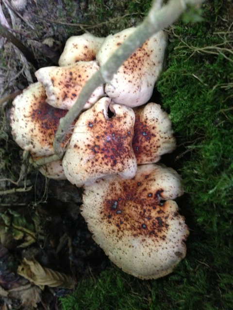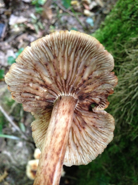 Fundort in einem Mischwals mit Kiefern auf einem alten Baumstumpf, Schüppchen lassen sich verschmieren, Geruch mild, Stil faserig weiß, Lamellen hell (cremeweiß).