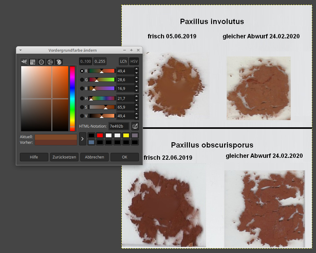 vielleicht lohnt es sich, diese wertvolle Beobachtung zu quantifizieren. Zumindest den (größten!) Einfluss verschiedener Monitore kann man umgehen, indem man die eingescannte Spp-Farbe im RGB- (oder HSV-)Farbraum auswertet. Siehe unten, ich habe vorher mit dem "Verschmieren"-Pinsel eine einheitliche Fläche geschaffen, damit ich mit der Pipette nicht irgendwelche Ausreißer-Pixel erwische. Könntest du dann wunderbare Diagramme mit verschieden braunen Balken draus basteln, wenn du zukünftig noch mehr Proben untersuchst.